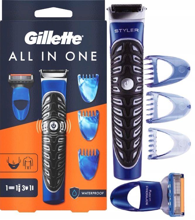 - Wodoodporna maszynka Gillette Fusion Proglide Styler z trymerem – doskonała do stylizacji i golenia.