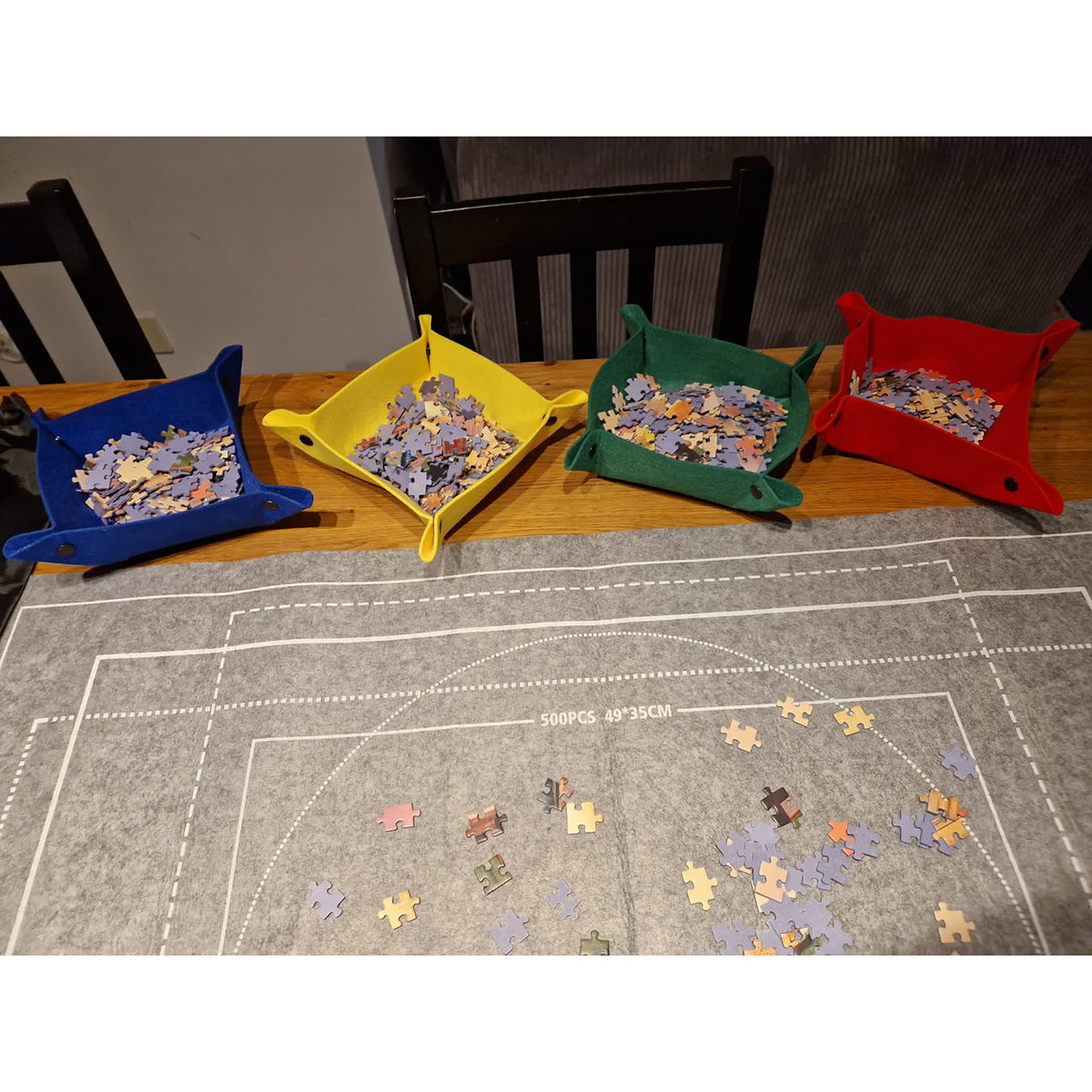 4 SAKIEWKI NA PUZZLE – w zestawie razem z matą są 4 sakiewki do sortowania puzzli, które umożliwiają rozdzielenie elementów na poszczególne grupy. Są to 4 wolnostojące kieszonki spinane na zatrzaski. Możesz więc przechowywać poszczególne grupy puzzli, bez obawy o ich rozsypanie.