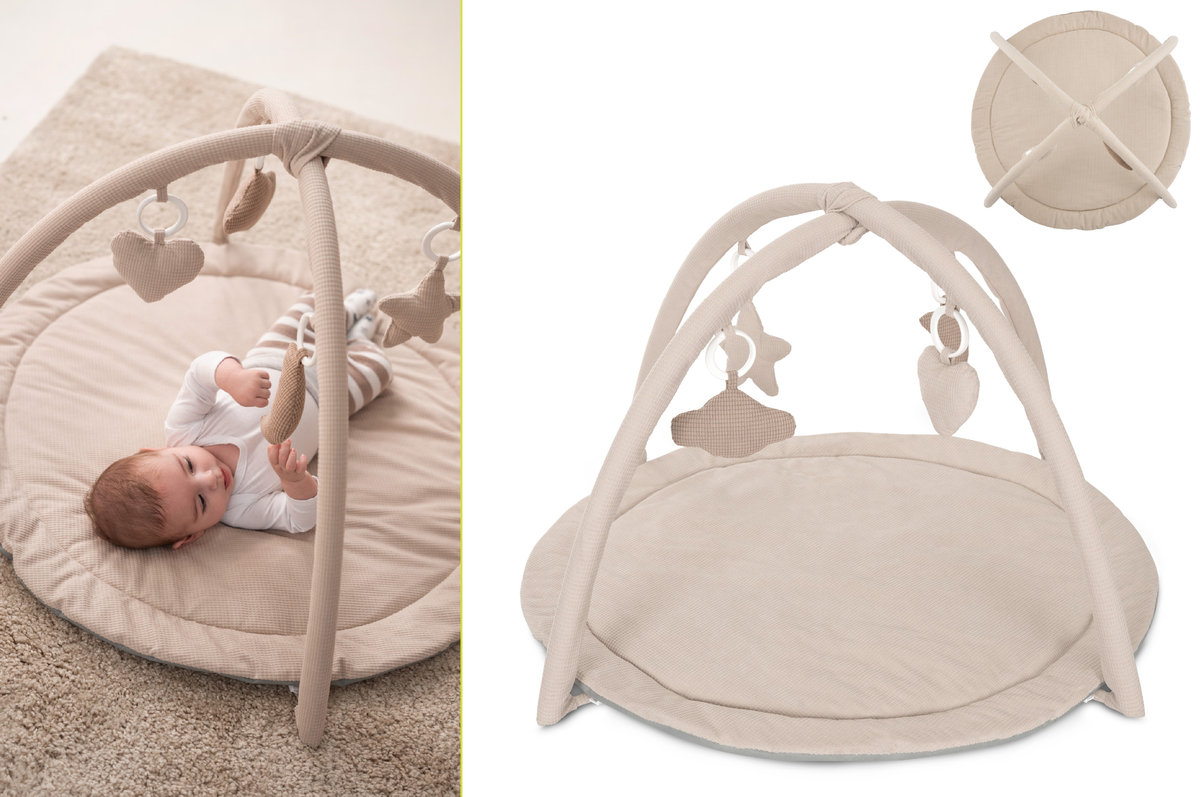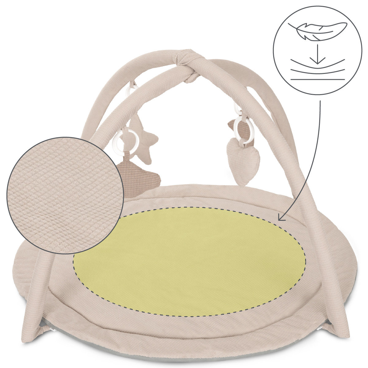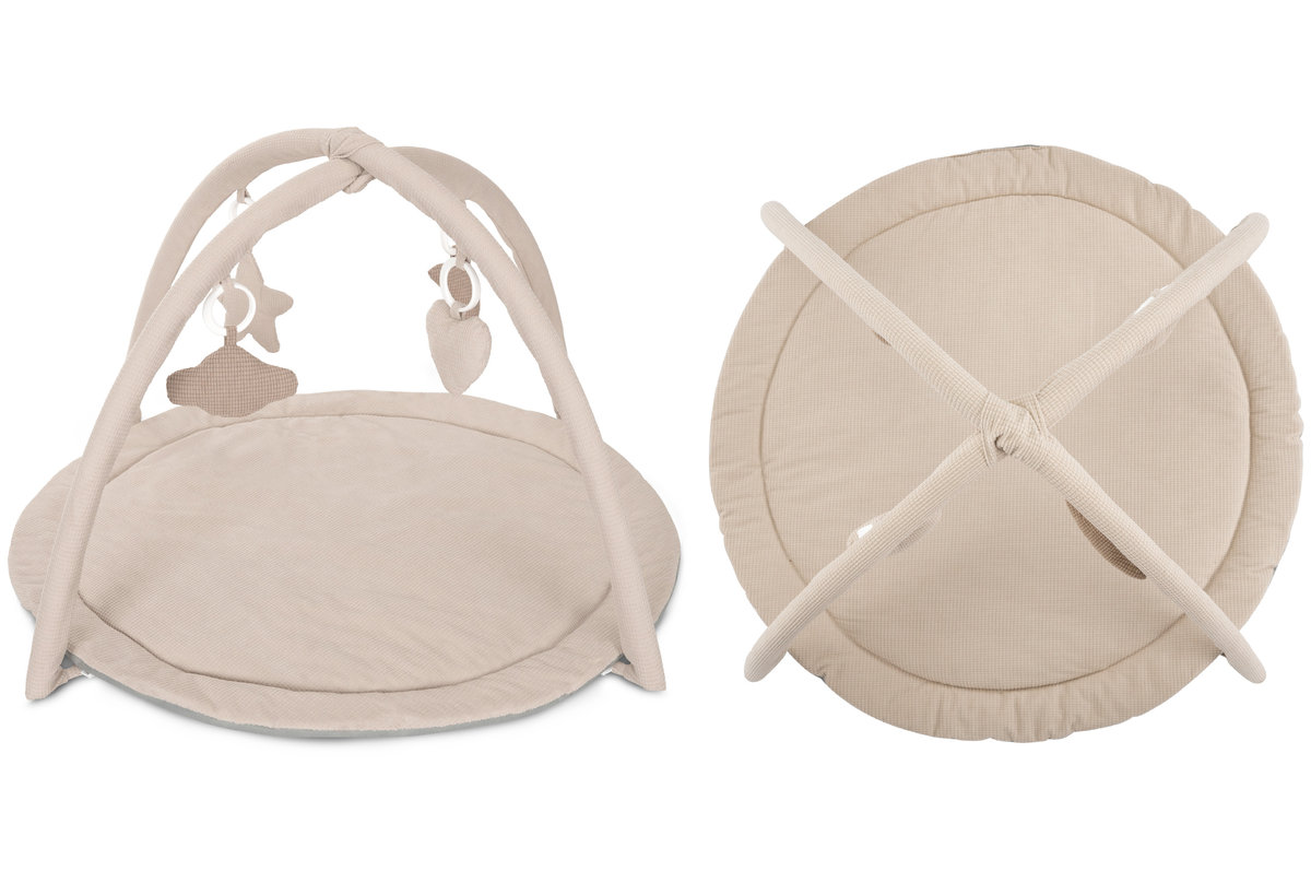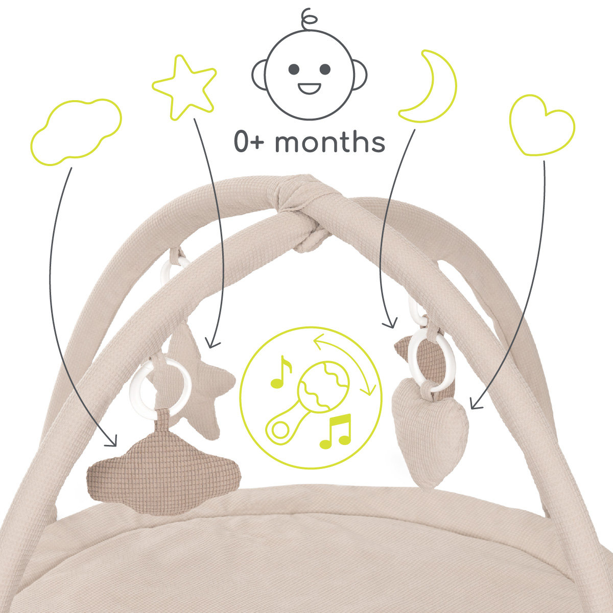Wymiary maty: 96 × 96 cm Wysokość z pałąkiem: 53 cm Zabawki: tekstylne, z dźwiękami i grzechotkami Materiał: miękka podszewka tekstylna Zdejmowany pałąk: tak Przeznaczenie: od narodzin Kolor: beżowySpecyfikacja: