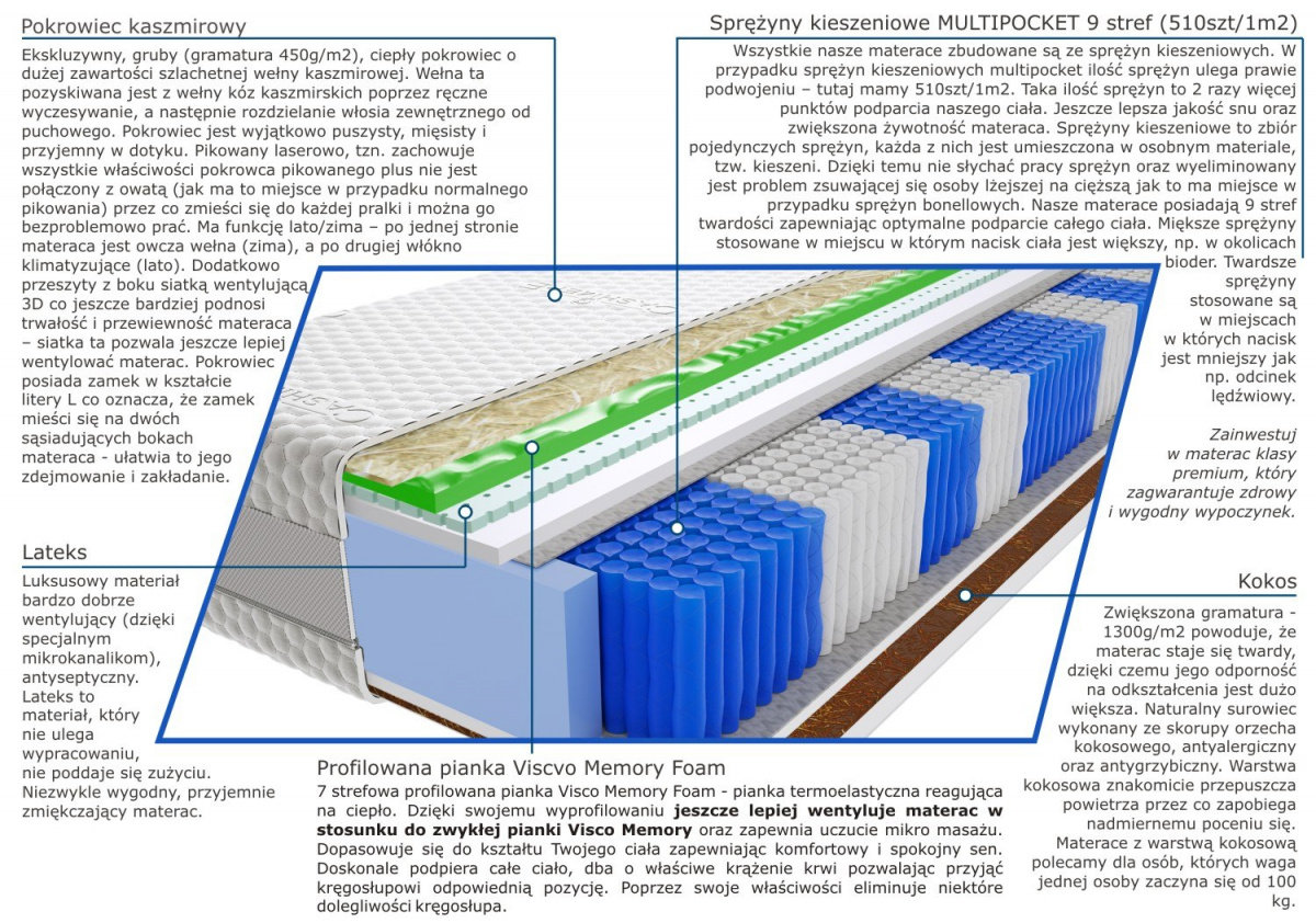 - Sprężyny kieszeniowe Multipocket 9 stref (510szt/1m2) - Wszystkie nasze materace zbudowane są ze sprężyn kieszeniowych. W przypadku sprężyn kieszeniowych multipocket ilość sprężyn ulega prawie podwojeniu – tutaj mamy 510szt/1m2. Taka ilość sprężyn to 2 razy więcej punktów podparcia naszego ciała. Jeszcze lepsza jakość snu oraz zwiększona żywotność materaca. Sprężyny kieszeniowe to zbiór pojedynczych sprężyn, każda z nich jest umieszczona w osobnym materiale, tzw. kieszeni. Dzięki temu nie słychać pracy sprężyn oraz wyeliminowany jest problem zsuwania się osoby lżejszej na cięższą jak to ma miejsce w przypadku sprężyn bonellowych.