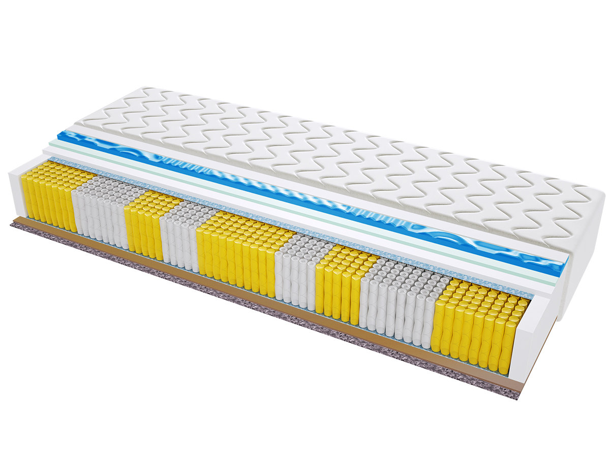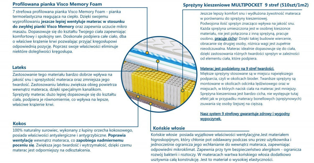 Sprężyny kieszeniowe 9 stref (510szt/1m2) - Sprężyny kieszeniowe multipocket 9 stref (510szt/1m2) - odgrywają główną rolę w budowie materaca. Jeszcze lepszy komfort snu i wydłużona żywotność materaca w stosunku do sprężyny pocketowej. Podwojona ilość sprężyn znacząco wpływa na jakość snu. Każda sprężyna umieszczona jest w osobnej kieszonce materiału, nie jest połączona z inną sprężyną, pracuje osobno, pracuje cicho! Dzięki takiej budowie wiercenie, obracanie się drugiej osoby, różnica wagi jest zupełnie nieodczuwalna. Materac idealnie dopasowuje się do ciała, dzięki zastosowania różnych twardości sprężyn w zależności od elementu ciała, które podpiera.