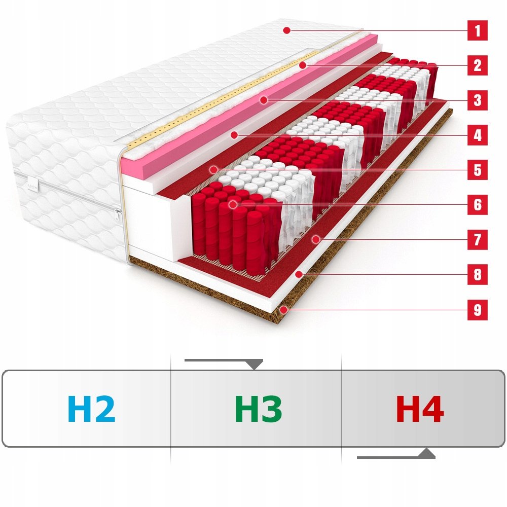| Wypełnienie: | sprężyny kieszeniowe, pianka poliuretanowa, kokos, lateks, filc, pianka termoelastyczna (visco) |