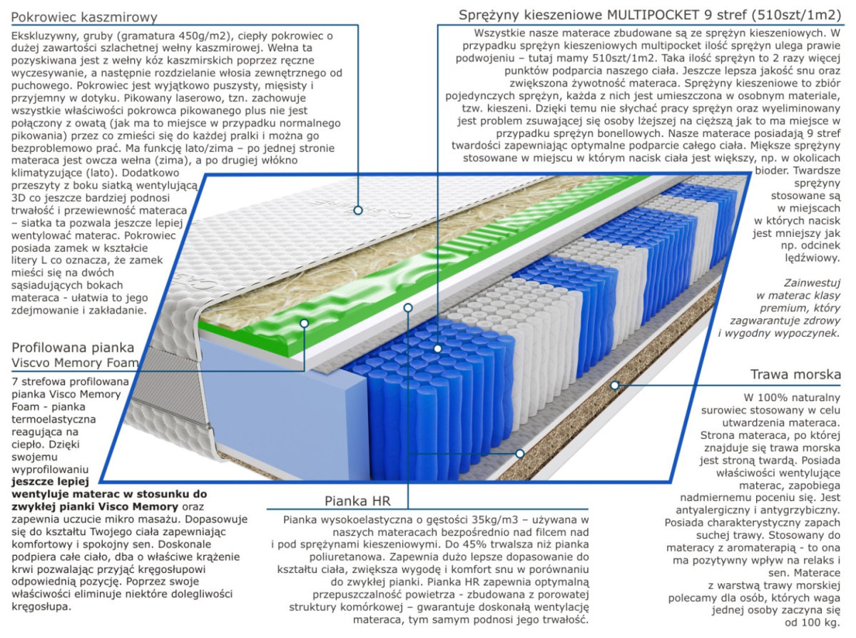 | Wypełnienie: | fizelina, wełna owcza, pianka poliuretanowa, filc, pianka wysokoelastyczna HR, sprężyny kieszeniowe multipocket, profilowana pianka Visco Memory, Trawa Morska |