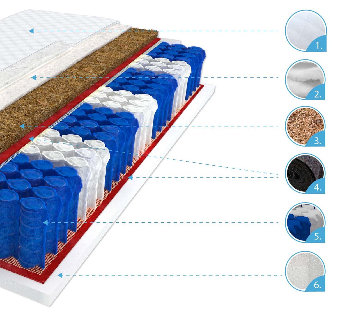 | Wypełnienie: | sprężyny kieszeniowe, pianka poliuretanowa, kokos |