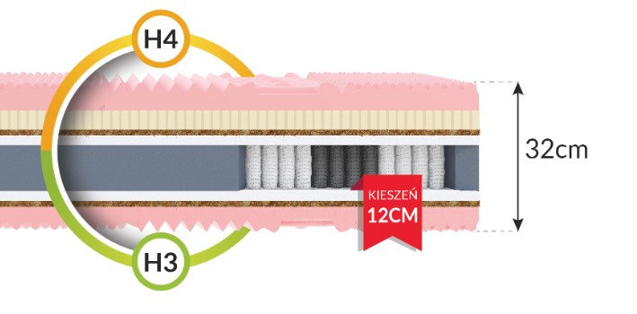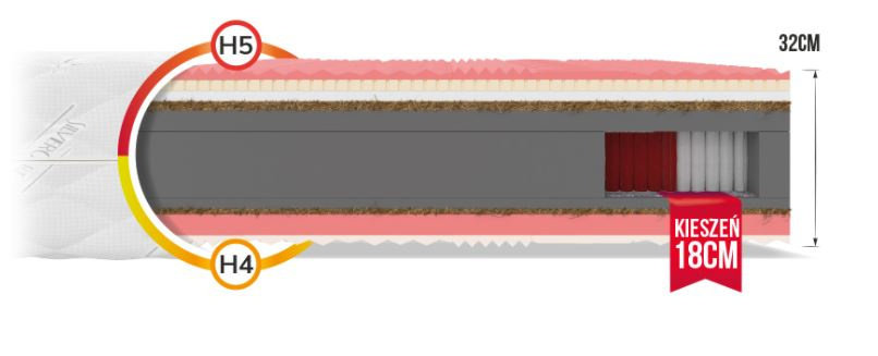 Materac multipocketowy CALYPSO - Wyjątkowy komfort i wsparcie dla zdrowego snu Materac CALYPSO to połączenie doskonałej konstrukcji multipocketowej z różnorodnymi piankami i matą kokosową, co zapewnia wyjątkowy komfort i wsparcie dla zdrowego snu. Jego wkład multipocketowy, składający się z wielu niezależnych sprężyn, podzielony jest na 7 stref podparcia ciała, dzięki czemu zapewnia odpowiednie wsparcie dla różnych części ciała podczas snu. Sprężyny NanoHARD charakteryzują się wyjątkową wytrzymałością i długą żywotnością. Zalety materaca CALYPSO: • Materac 7 strefowy, idealnie podpierający całe ciało. • Zapewniający wyjątkowy komfort i wytrzymałość. • Model dwustronny - z możliwością wyboru twardości H4 i H5. • Posiadający cechy antyalergiczne - odpowiedni dla osób z alergiami. • Idealne podparcie dla osób z bólami kręgosłupa. • Zapewniający bardzo dobrą cyrkulację powietrza. Baza materaca CALYPSO została wzbogacona warstwą pianki termoplastycznej VISCO, która doskonale dopasowuje się do sylwetki użytkownika pod wpływem ciężaru i ciepła, zapewniając wyjątkowy komfort. Z drugiej strony materaca znajduje się warstwa pianki lateksowej, która jest miękka, elastyczna i trwała. Jej perforowana struktura pozwala na swobodny przepływ powietrza, co skutecznie hamuje namnażanie się uczulających drobnoustrojów. Dodatkowo, pianka visco V40 o specjalnym profilu przylega jeszcze lepiej do ciała, zapobiega odleżynom i redukuje bóle kręgosłupa. Wkład kokosowy w komplecie zapewnia dodatkową przewiewność, elastyczność i trwałość. Materac CALYPSO posiada certyfikat OEKO-TEX®, potwierdzający jego wysoką jakość i bezpieczeństwo. Specyfikacja materaca CALYPSO: • Twardość: H4 twardy, H3 średnio twardy. • Grubość: 32 cm. • Wysokość sprężyn: 12 cm. Skład materaca CALYPSO: • Profilowana pianka VISCO V40: 4 cm. • Lateks: 4 cm. • Wkład kokosowy: 1 cm. • Pianka poliuretanowa T25: 2 cm. • Pokrowiec: 1 cm. • Pianka Poliuretanowa T25: 6 cm. • Pianka profilowana VISCO: 2 cm. • Wkład kokosowy: 1 cm. Zapewnij sobie wyjątkowy komfort snu i wsparcie dla zdrowego wypoczynku dzięki materacowi CALYPSO. Odkryj radość snu na najwyższym poziomie!