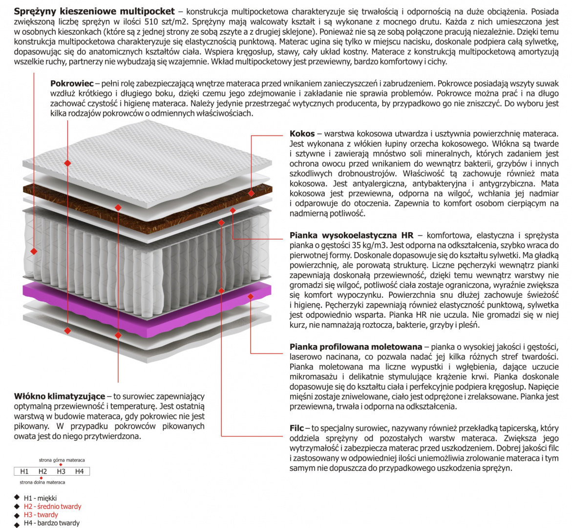 Sprężyny kieszeniowe multipocket– konstrukcja multipocketowa charakteryzuje się trwałością i odpornością na duże obciążenia. Posiada zwiększoną liczbę sprężyn w ilości 510 szt/m2. Sprężyny mają walcowaty kształt i są wykonane z mocnego drutu. Każda z nich umieszczona jest w osobnych kieszonkach (które są z jednej strony ze sobą zszyte a z drugiej sklejone). Ponieważ nie są ze sobą połączone pracują niezależnie. Dzięki temu konstrukcja multipocketowa charakteryzuje się elastycznością punktową. Materac ugina się tylko w miejscu nacisku, doskonale podpiera całą sylwetkę, dopasowując się do anatomicznych kształtów ciała. Wspiera kręgosłup, stawy, cały układ kostny. Materace z konstrukcją multipocketową amortyzują wszelkie ruchy, partnerzy nie wybudzają się wzajemnie. Wkład multipocketowy jest przewiewny, bardzo komfortowy i cichy.