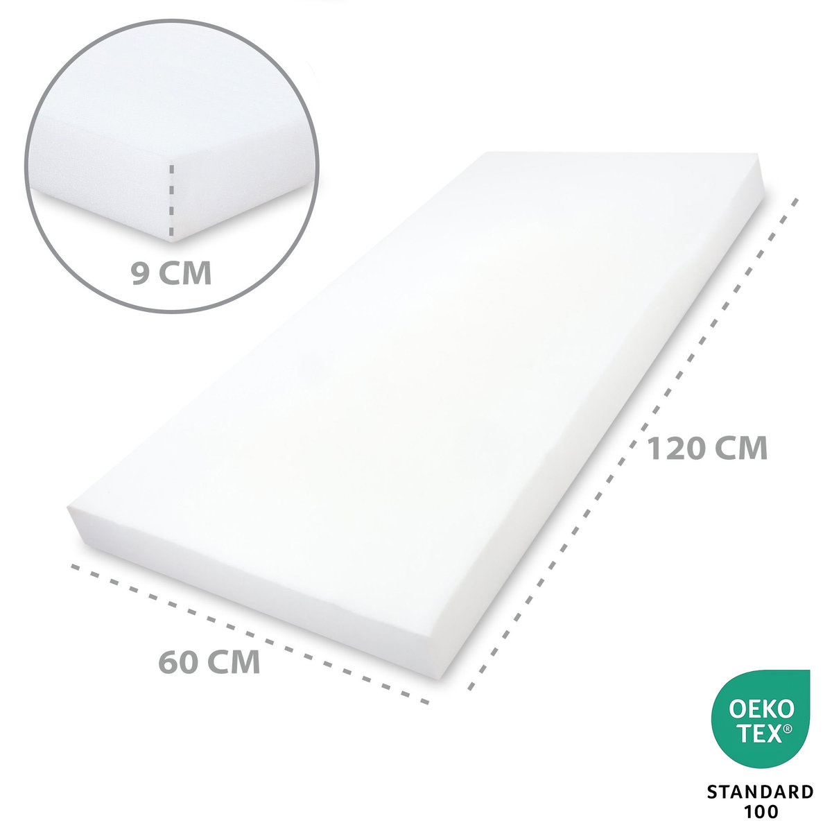Opcjonalnie płyta piankowa dostępna jest w wersji materaca dziecięcego 70 x 140 cm oraz materaca do łóżeczka dziecięcego 60 x 120 cm, w zależności od indywidualnych potrzeb. Dzięki standardowym rozmiarom, ten materac piankowy idealnie nadaje się do łóżeczek dziecięcych, łóżeczek turystycznych i łóżeczek podłogowych. Nadaje się do codziennego użytku, a także jako materac podróżny do łóżeczka dziecięcego.
