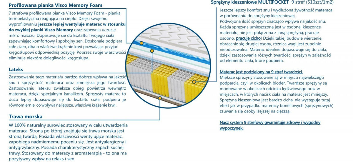 | Wypełnienie: | fizelina, pianka poliuretanowa, pianka lateksowa, filc, sprężyny kieszeniowe multipocket, profilowana pianka Visco Memory, Trawa Morska |