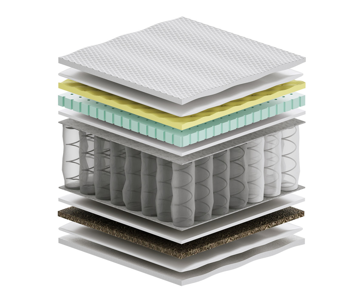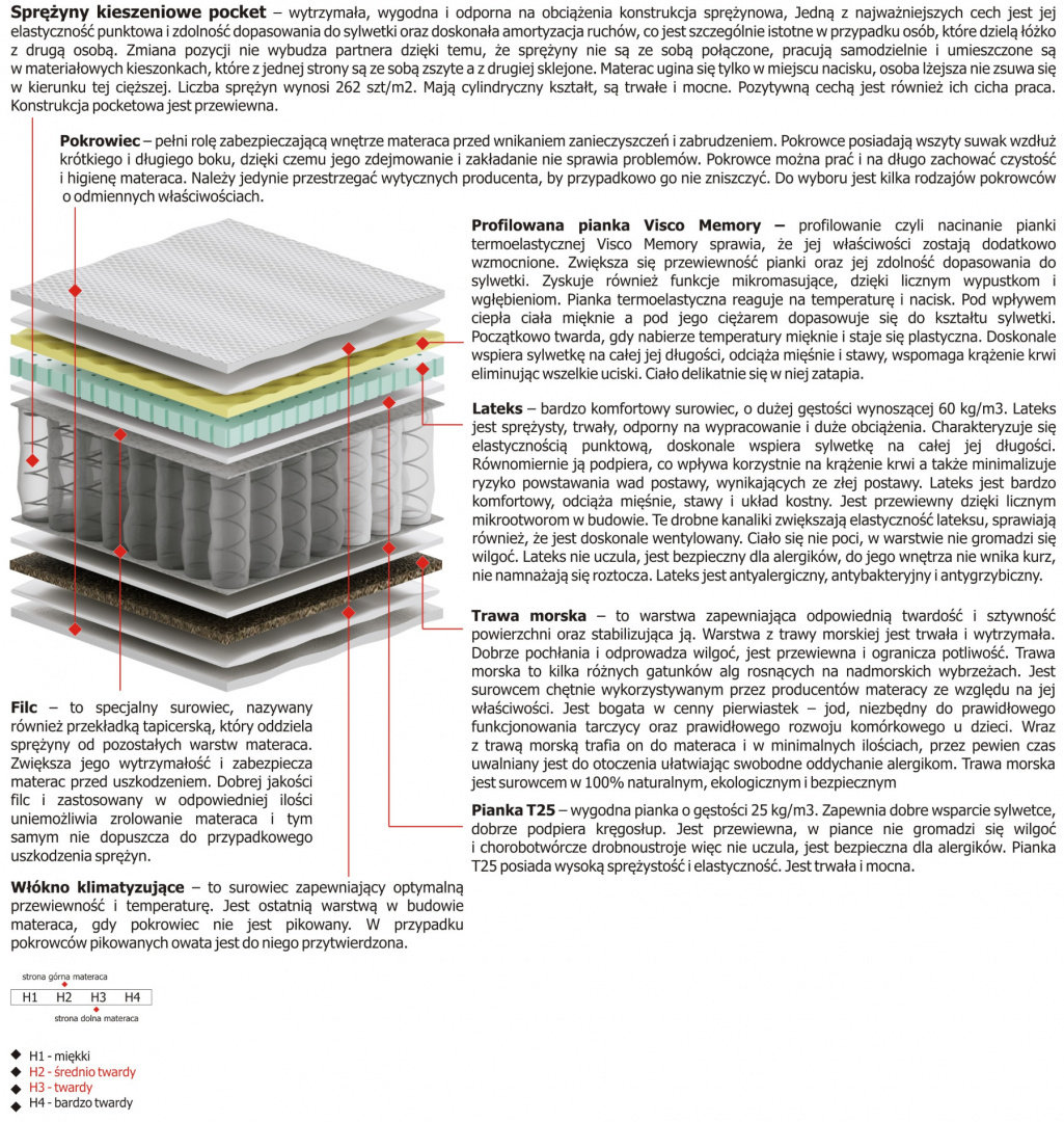 | Wypełnienie: | fizelina, pianka poliuretanowa, pianka lateksowa, sprężyny kieszeniowe, filc, profilowana pianka Visco Memory, Trawa Morska |