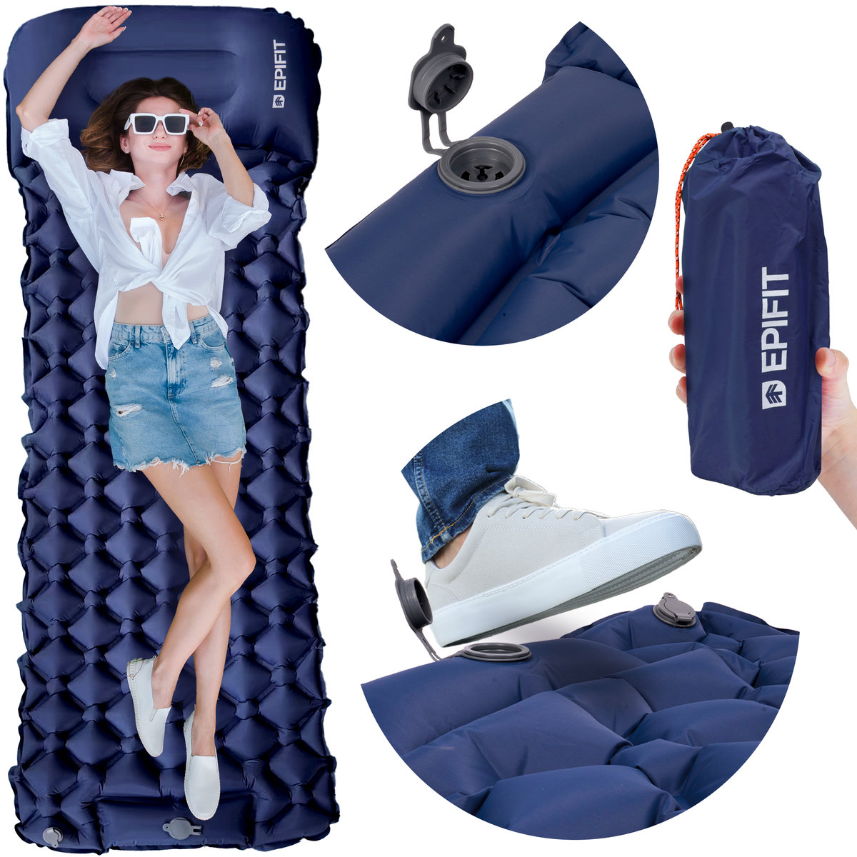 - Samopompujący z wbudowaną pompką nożną – nie potrzebujesz dodatkowego sprzętu do napompowania – wystarczy naciskać pompkę wbudowaną w materac.