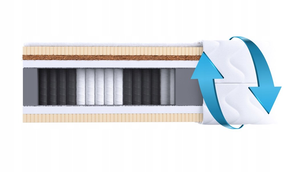 Górna strona materaca H4 - znajduje się warstwa lateksu oraz mata kokosowa, które są znane ze swoich właściwości antyalergicznych. Te naturalne materiały nie tylko wspierają zdrowy sen, ale również zapewniają lepszą cyrkulację powietrza, co przekłada się na komfortowe warunki odpoczynku. Lateks charakteryzuje się elastycznością, co umożliwia doskonałe dopasowanie do kształtu ciała, podczas gdy mata kokosowa dodatkowo wzmacnia strukturę materaca, oferując odpowiednie podparcie i trwałość.