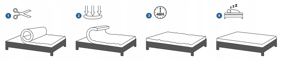 (1) Po otrzymaniu materaca, zdejmij z niego folię ochronną. (2) Umieść materac na stelażu łóżka. (3) Pozostaw materac na 48-72 godziny, aby osiągnął pełną objętość. (4) Używaj materaca dopiero po przywróceniu jego właściwego kształtu.