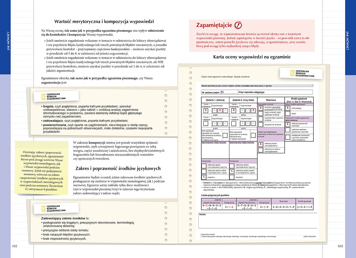 Wiele autorskich rad dotyczy unikania stresu i straty czasu w ramach przygotowania do mówienia i pisania. Są one poparte przykładami tematów i zadań ustnych, które występowały na egzaminach maturalnych oraz omówieniem prac uczniowskich na tematy zaproponowane przez same autorki. Najważniejsze wnioski, które płyną z tej publikacji są takie: