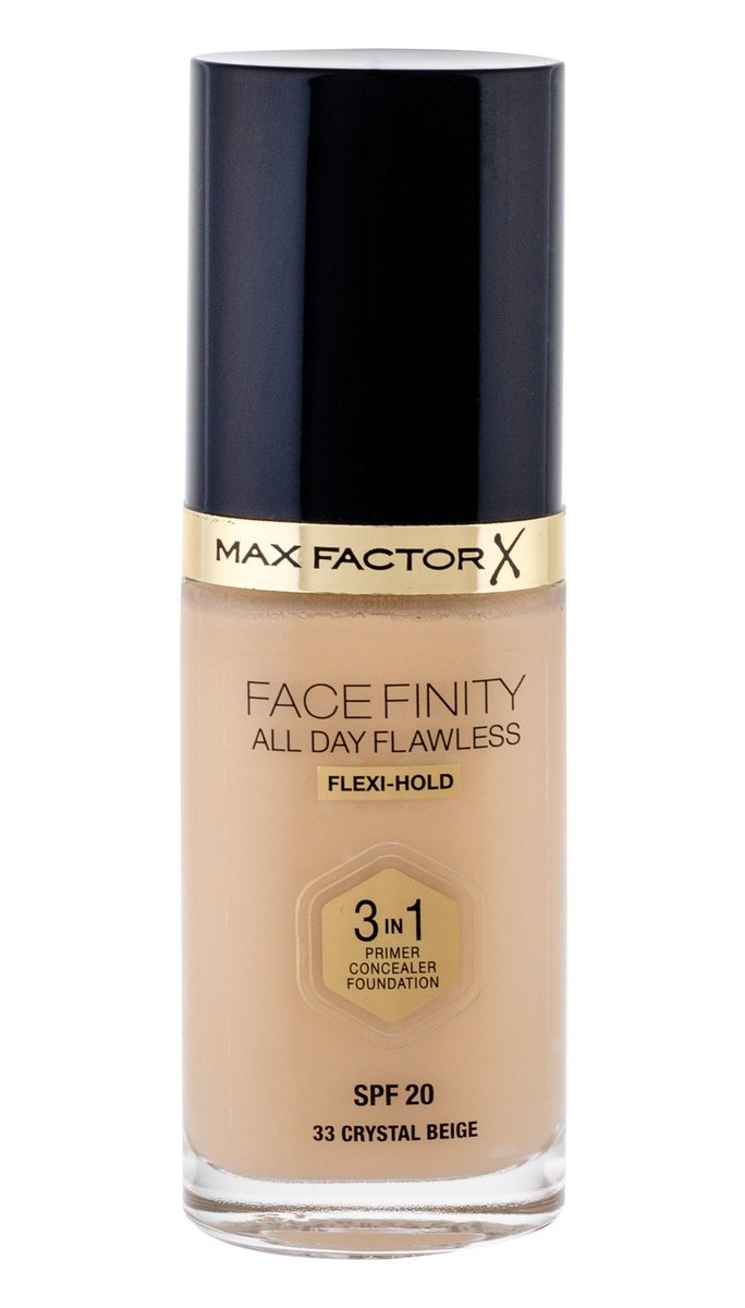 Wypróbuj Max Factor Facefinity 3 w 1 w odcieniu Crystal Beige – matujący podkład w płynie, bazę i korektor w jednym. Ten kryjący podkład nadaje się do każdego typu cery, jest wodoodporny, a filtry SPF 20 chronią twarz przed szkodliwym działaniem słońca. Formuła podkładu jest odporna na ścieranie i błyszczenie. Dzięki zaawansowanej technologii Flexi-hold™ podkład dopasowuje się do mimiki twarzy i utrzymuje się na skórze nawet do 24 godzin. Ciesz się naturalną cerą bez efektu maski! Podkład kryjący Max Factor Facefinity All Day Flawless 3 w 1 idealnie stapia się ze skórą, co ułatwia jego nakładanie i uzyskanie efektu pełnego krycia. Lekka formuła nie zatyka porów i daje doskonale utrwalenie. Przebadany dermatologicznie.
