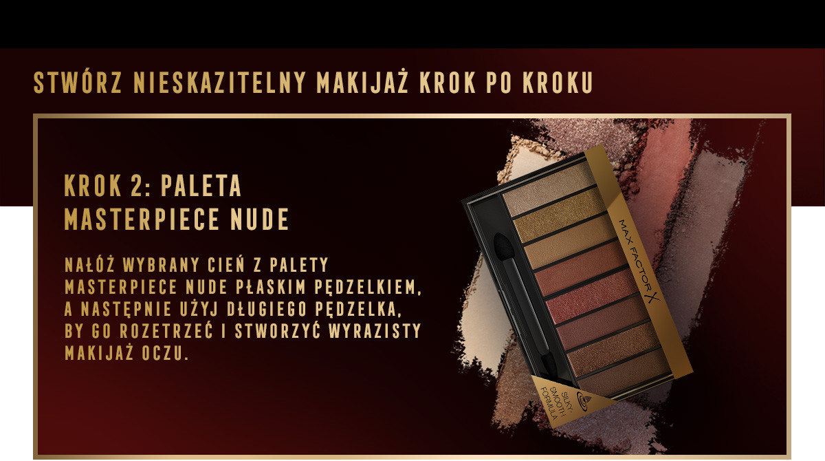 NAŁÓŻ WYBRANY CIEŃ Z PALETY MASTERPIECE NUDE PŁASKIM PĘDZELKIEM, A NASTĘPNIE UŻYJ DŁUGIEGO PĘDZELKA, BY GO ROZETRZEĆ I STWORZYĆ WYRAZISTY MAKIJAŻ OCZU.