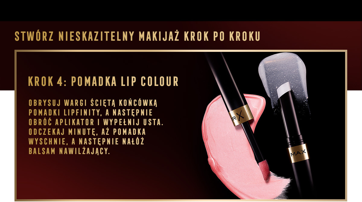 OBRYSUJ WARGI ŚCIĘTĄ KOŃCÓWKĄ POMADKI LIPFINITY, A NASTĘPNIE OBRÓĆ APLIKATOR I WYPEŁNIJ USTA. ODCZEKAJ MINUTĘ, AŻ POMADKA WYSCHNIE, A NASTĘPNIE NAŁÓŻ BALSAM NAWILŻAJĄCY.