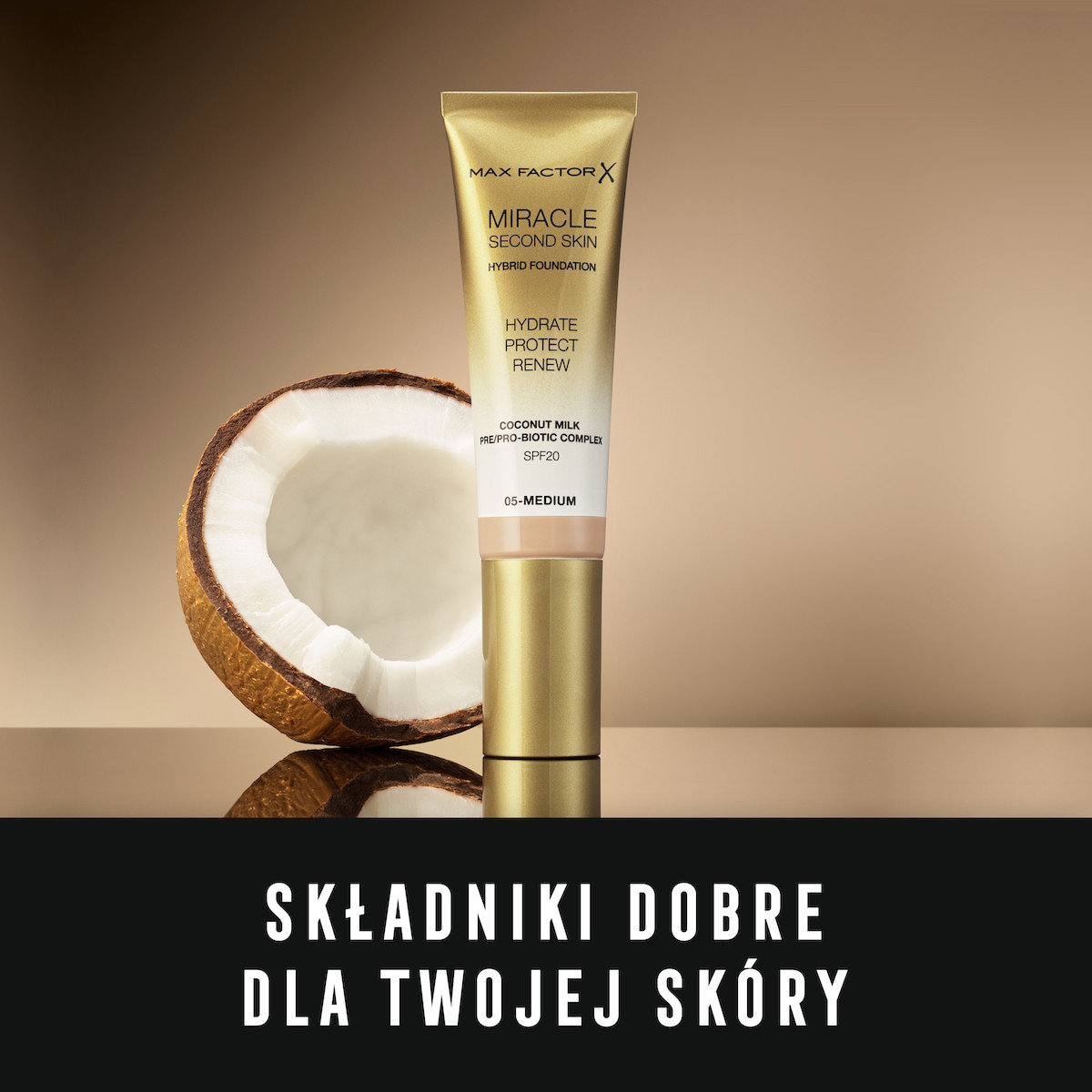 Max Factor Miracle Second Skin to wyjątkowe połączenie upiększającego podkładu z pielęgnującą formułą. Mleczko kokosowe pochodzenia naturalnego doskonale nawilża skórę, która pozostaje miękka i promienna przez cały dzień. Bogata i lekka konsystencja z łatwością wnika w pory, zapewniając niewidoczne, niewyczuwalne krycie oraz efekt drugiej skóry. Wzbogacony o probiotyki i prebiotyki podkład z filtrem UV wspiera naturalną warstwę ochronną skóry, a przebadana klinicznie formuła Miracle Second Skin wspomaga proces odnowy naskórka i zawiera filtr SPF 20 dla dodatkowej ochrony. Podkład do twarzy Max Factor jest odpowiedni dla wszystkich rodzajów skóry, nawet dla skóry wrażliwej.