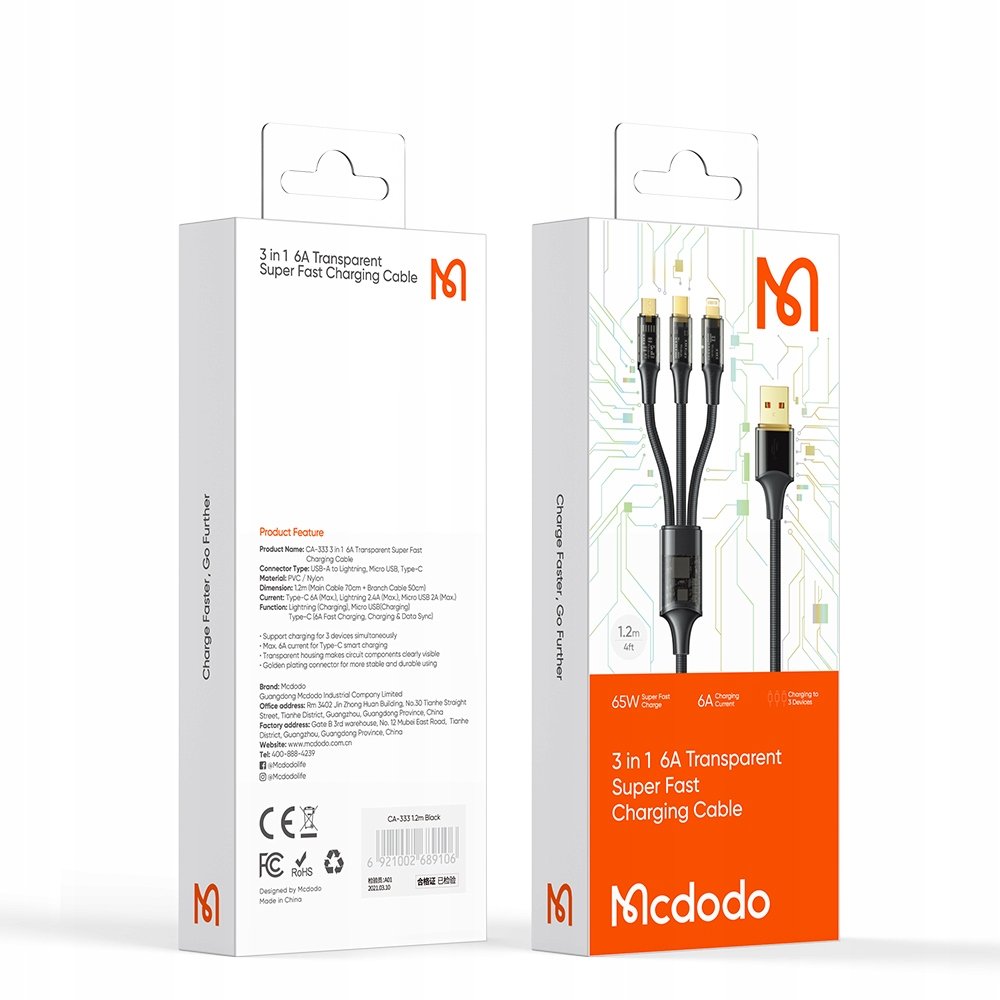 Mcdodo Amber Series Kabel Micro USB Lightning USB-C 3w1 100W 6A 1,2m