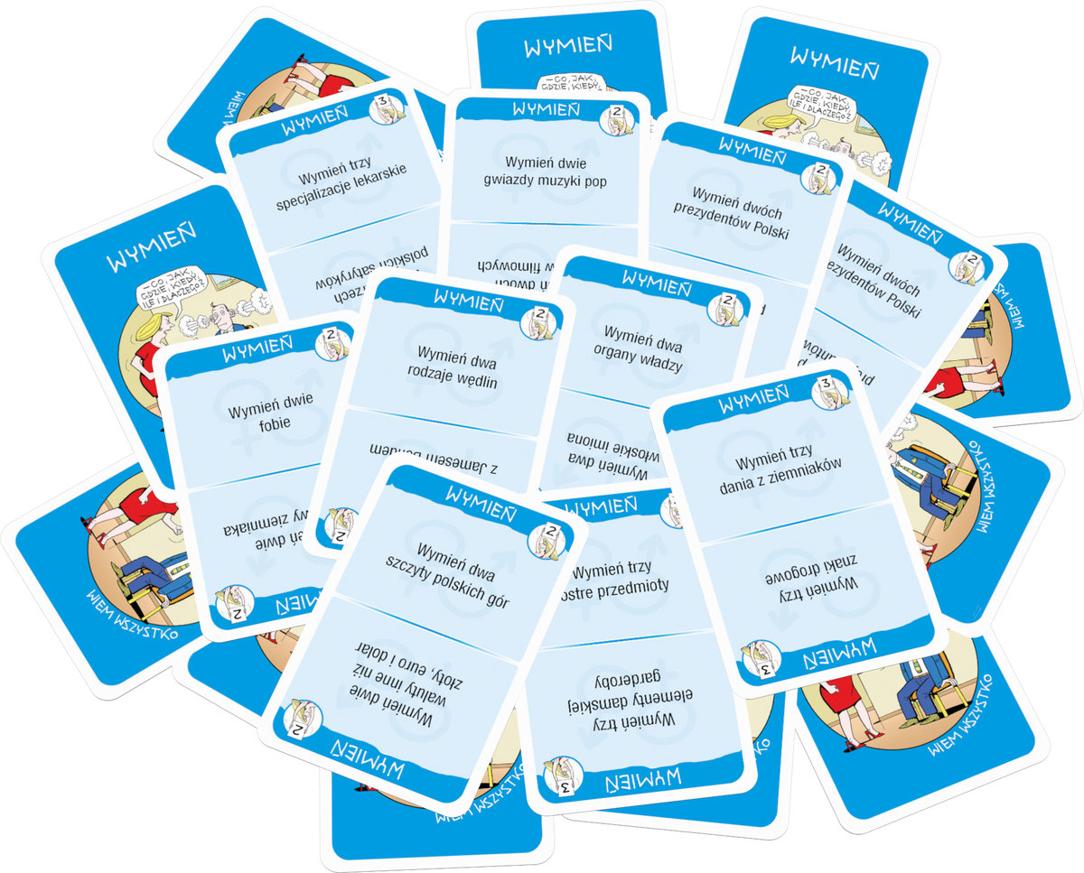 ”Wiem wszystko” to planszowa wersja teleturnieju, w którą można grać we dwoje lub parami, w większym gronie znajomych. Pytania nawiązują do najsłynniejszych formatów show telewizyjnych i odnoszą się do najróżniejszych dziedzin. Są to zarówno pytania z zakresu wiedzy o świecie zwierząt i roślin (Nazwa najszybszego kroku konia), jak i pytania odnoszące się do życia codziennego (Wymień dwa rodzaje wędlin). Uczestnicy udzielają odpowiedzi pod presją czasu, który odmierza klepsydra. Czy w kilkanaście sekund jesteś w stanie wymienić prezydentów Polski? Albo przypomnieć sobie trzy specjalizacje lekarskie? Sprawdź swoją pamięć, koncentrację i skojarzenia!