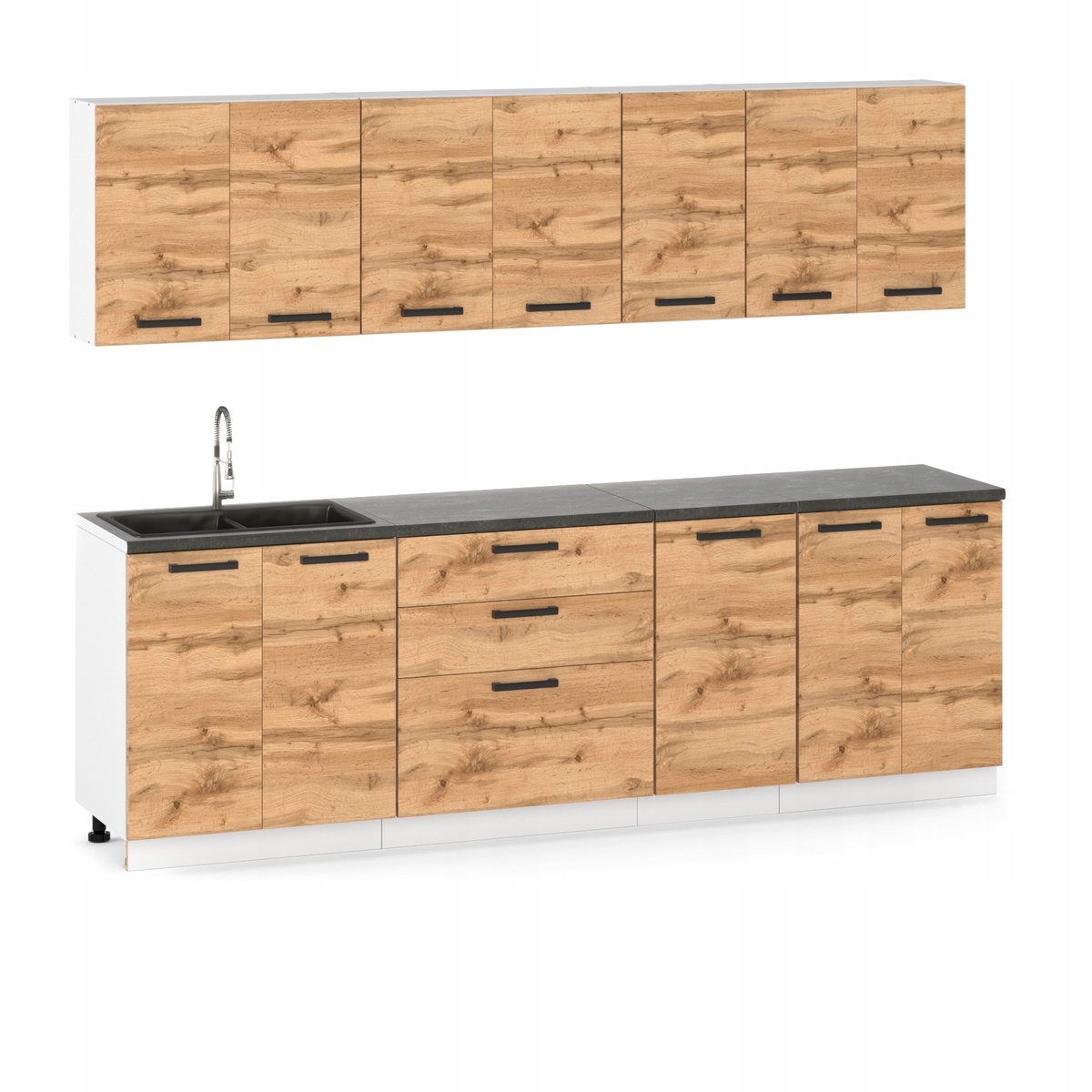 Dzięki przemyślanemu układowi szafek, zestaw oferuje dużą pojemność przechowywania, umożliwiając wygodną organizację przestrzeni kuchennej. Ergonomiczne uchwyty gwarantują komfortowe użytkowanie każdego dnia.