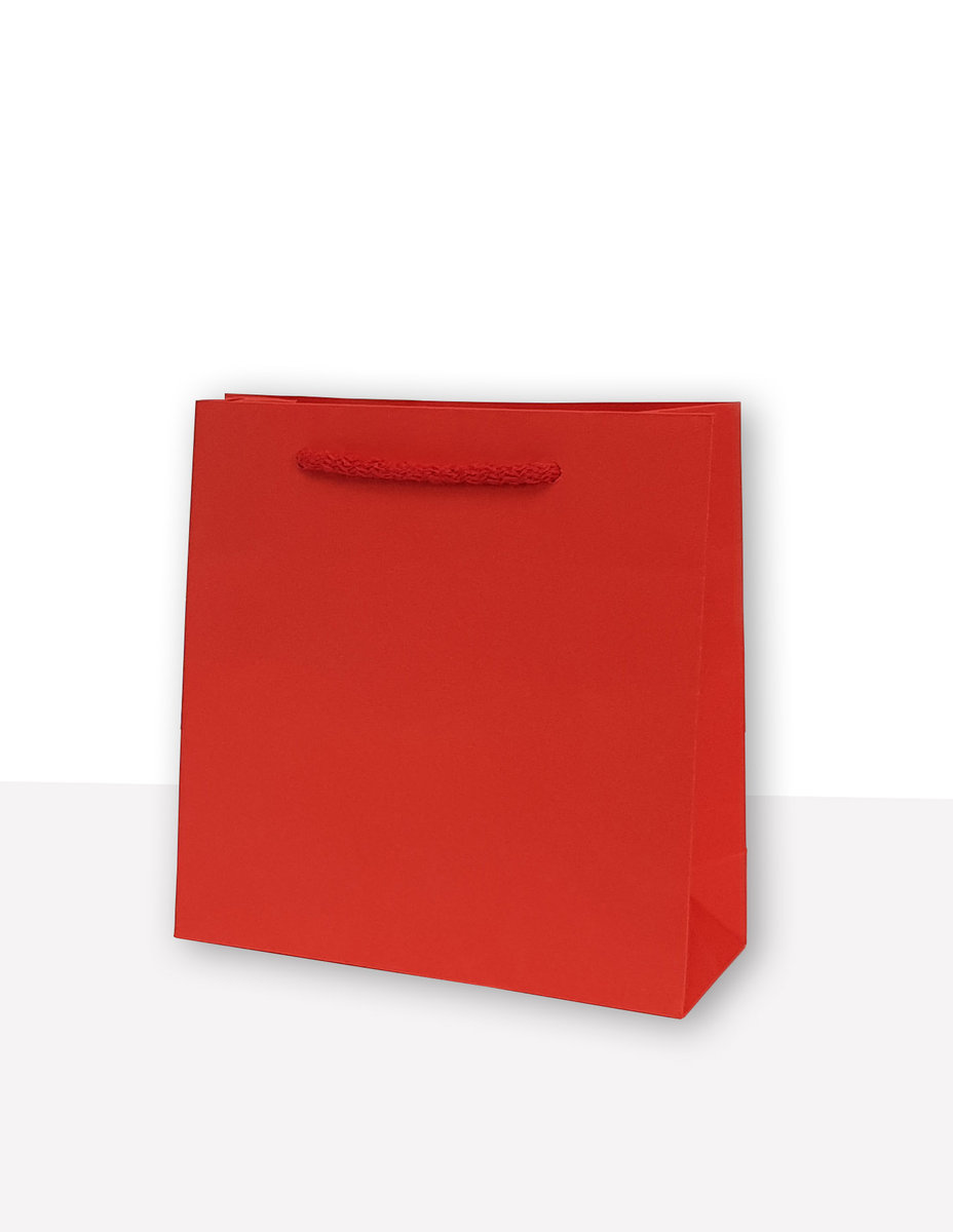 Torba jednobarwna czerwona o wymiarze wys 17 cm szer 17 cm głęb 6,5 cm wykonana z papieru barwionego w masie o gramaturze min 120g/m2, uchwyt sznurkowy bawełniany,usztywnione kartonem denko i ...