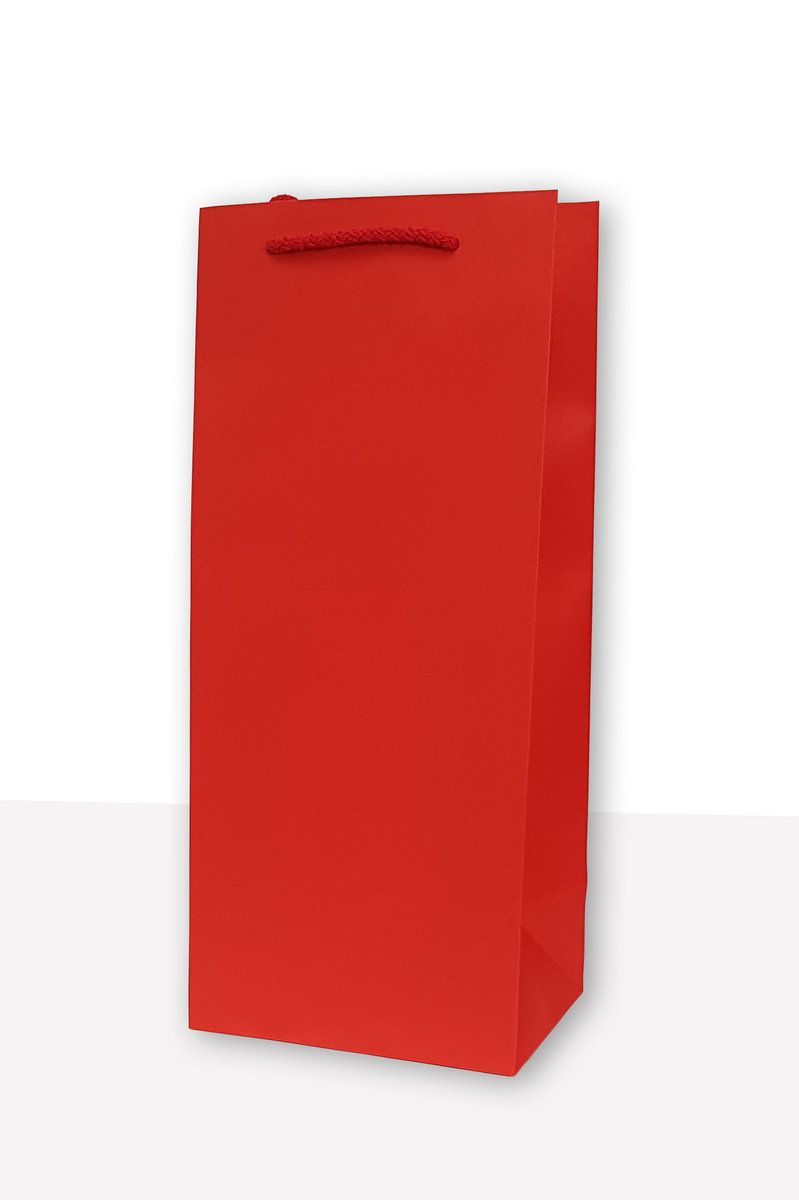 Torba jednobarwna czerwona o wymiarze wys 34 cm szer 13,5 cm głęb 9,5 cmwykonana z papieru barwionego w masie o gramaturze min 120g/m2, uchwyt sznurkowy bawełniany, usztywnione kartonem denko i ...
