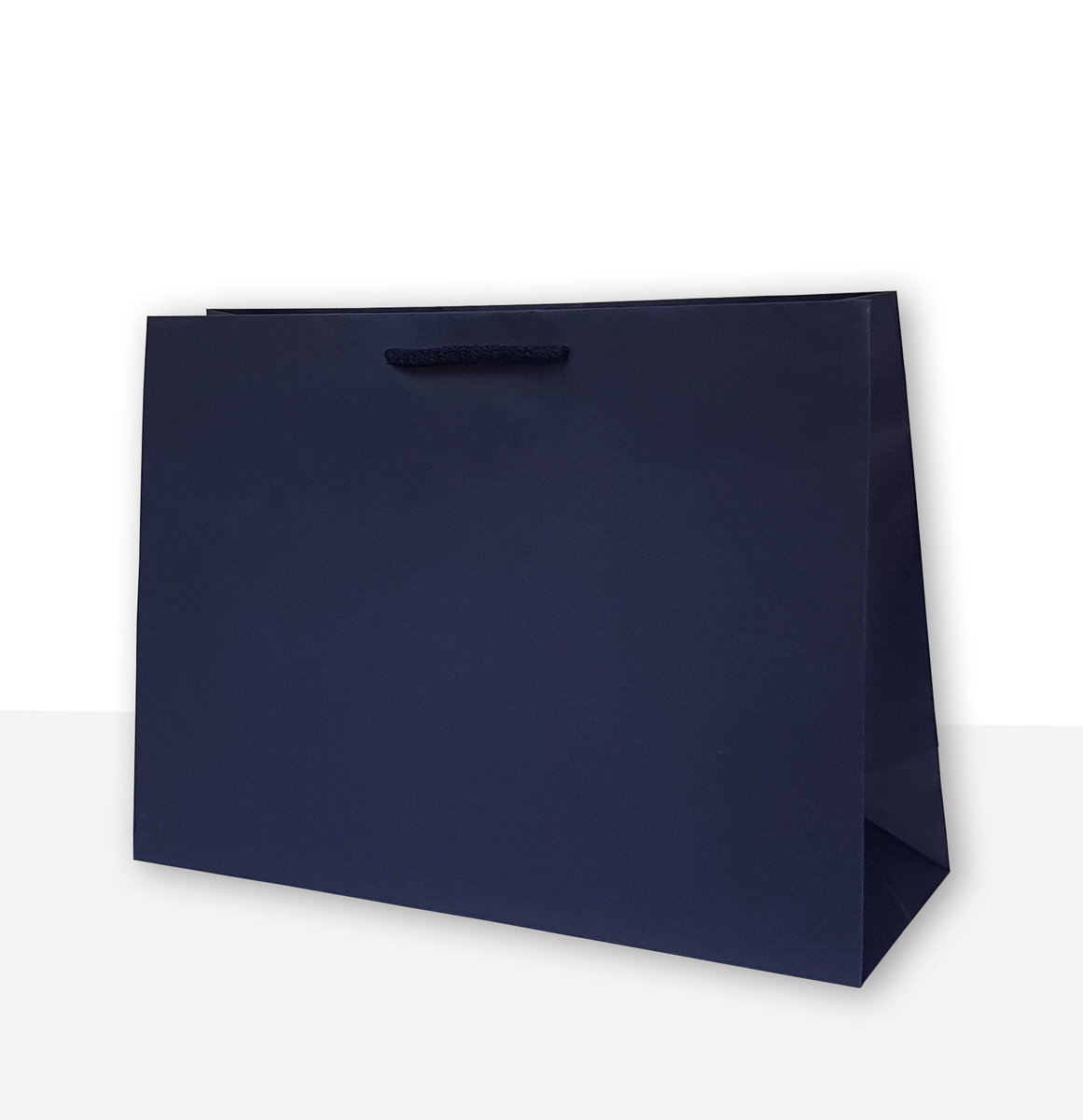 Torba jednobarwna granatowa o wymiarze wys 25 cm szer 34 cm głęb 12 cm wykonana z papieru barwionego w masie o gramaturze min 120g/m2,uchwyt sznurkowy bawełniany,usztywnione kartonem denko i zakładki