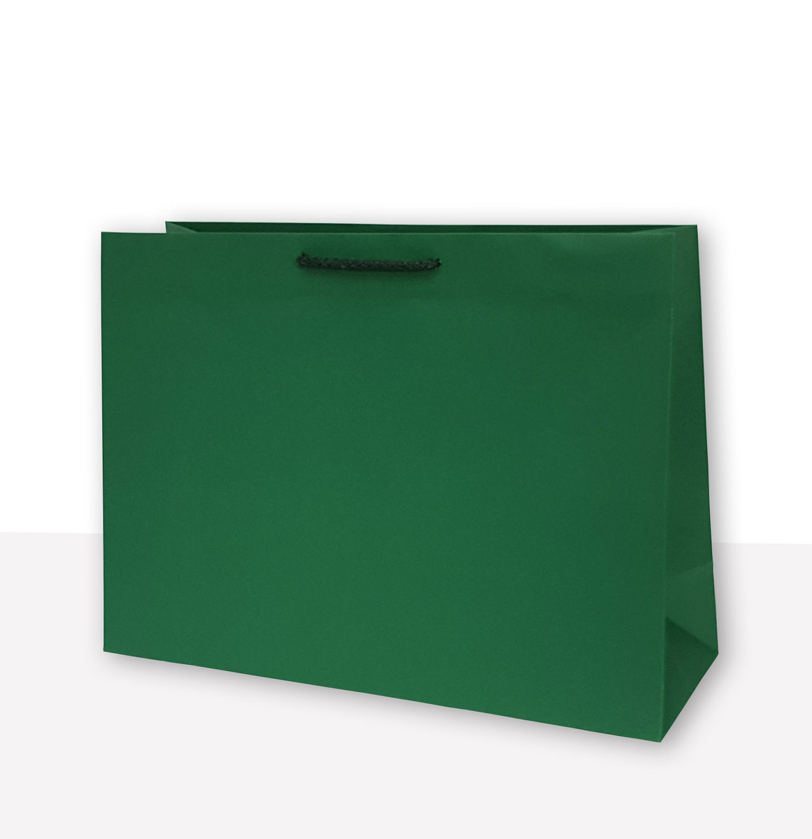 Torba jednobarwna zielona o wymiarze wys 25 cm szer 34 cm głęb 12 cm wykonana z papieru barwionego w masie o gramaturze min 120g/m2, uchwyt sznurkowy bawełniany, usztywnione kartonem denko i zakładki