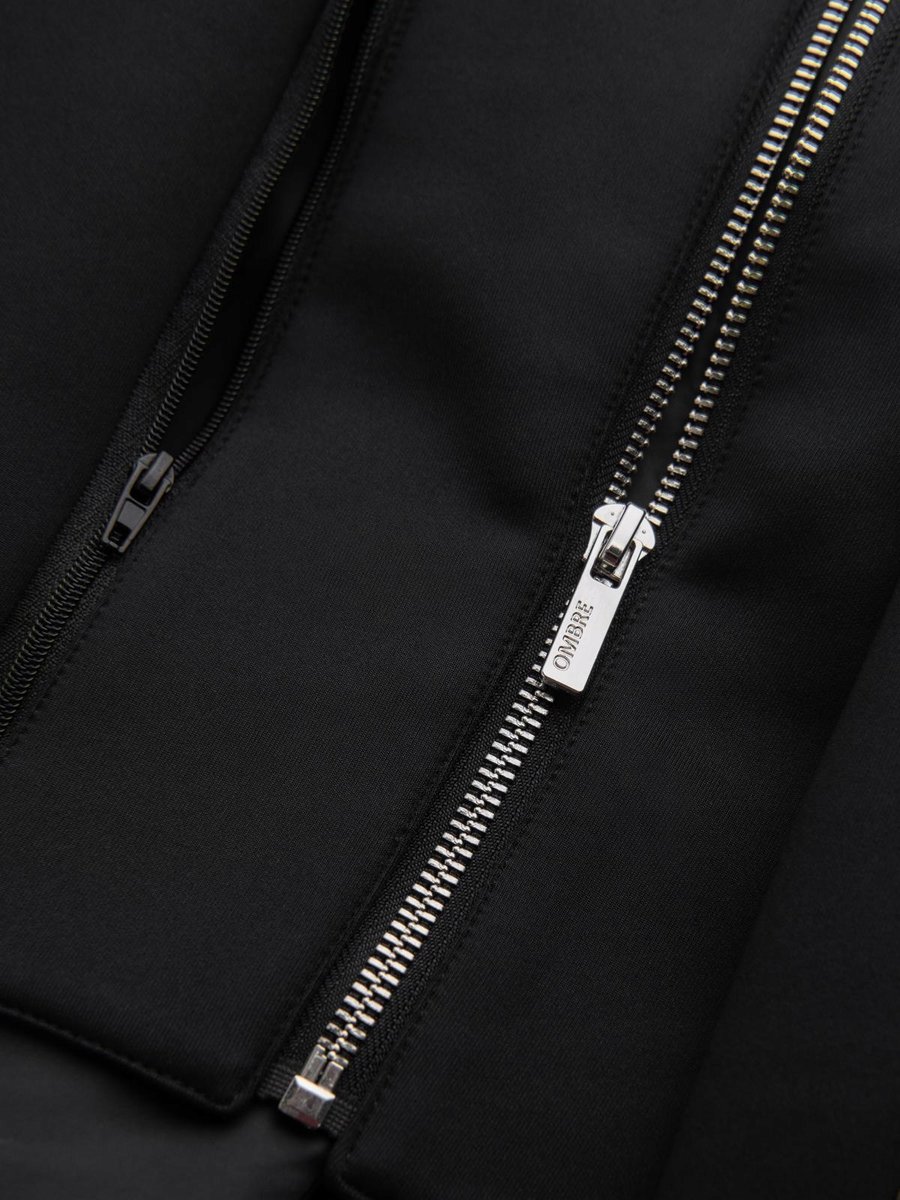 kolekcja Ombre Eximio męska marynarka jednorzędowe zapięcie na zatrzaski zapinana na suwak podpinka z regulowanym kapturem imitacja przednich kieszeni wewnętrzna kieszeń w podszewce rozcięcie z tyłu marynarki Materiał: 95% poliester, 5% spandex Kolor: czarny Wzrost modela 184 cm. Model prezentuje produkt w rozmiarze: M