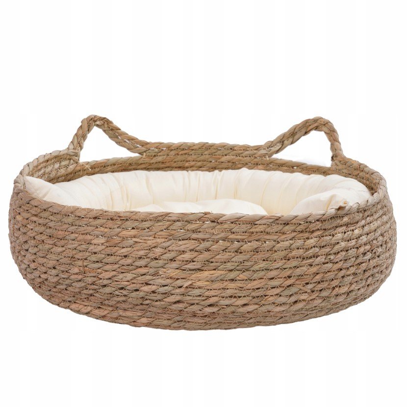 ➡️ Koszyk wyposażony jest w uchwyt w kształcie kocich uszek. Jest to rozwiązanie praktyczne- pomaga z jego przenoszeniem. Dodatkowo uszka wyglądają uroczo, ładnie ozdabiając pomieszczenie, w którym legowisko się znajduje.
