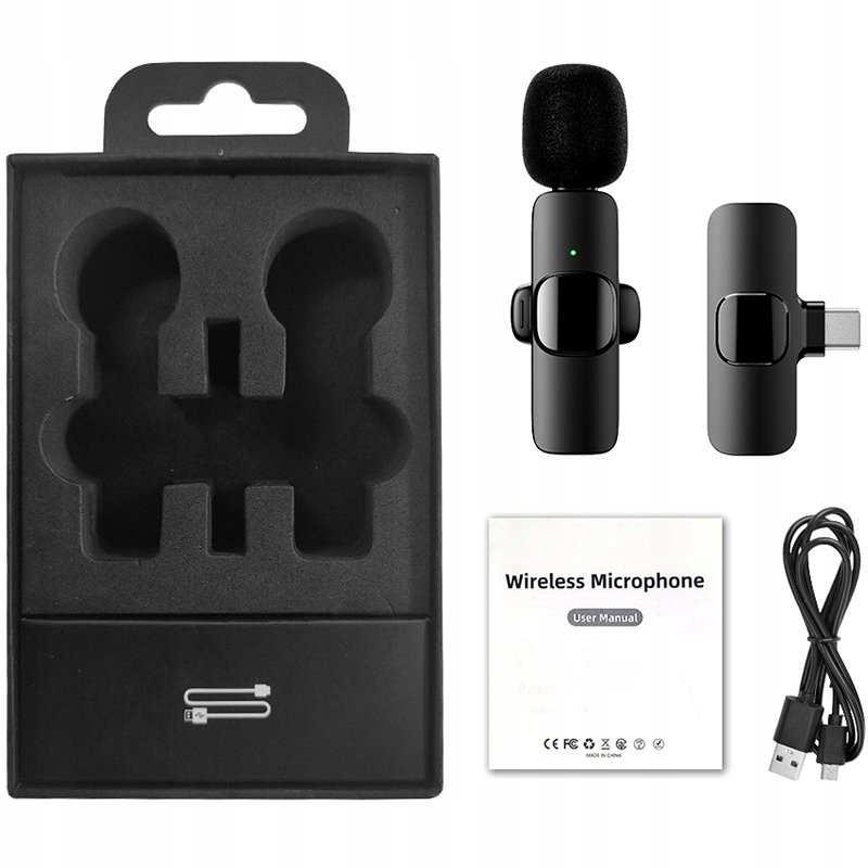 - W zestawie: 1 mikrofon Apexel, odbiornik USB-C, instrukcja obsługi, kabel do ładowania USB-C