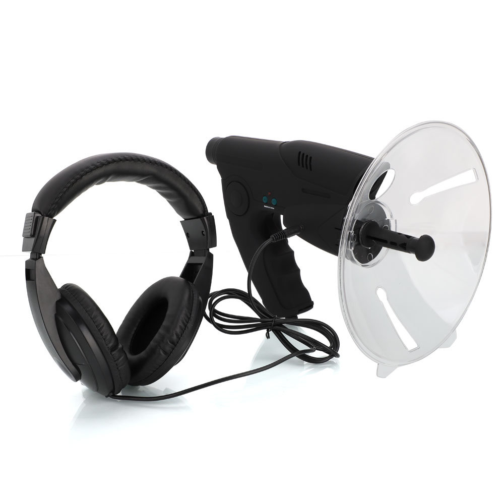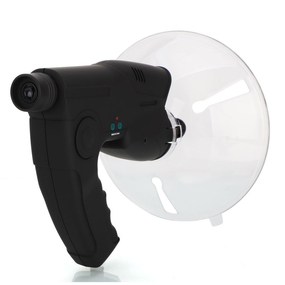 Paraboliczna antena skupiająca dźwięk pozwala na świetny odbiór dźwięków, a zintegrowany obiektyw z przybliżeniem x8 pozwala na obserwacje np. nasłuchiwanego ptaka lub podsłuchiwanej osoby