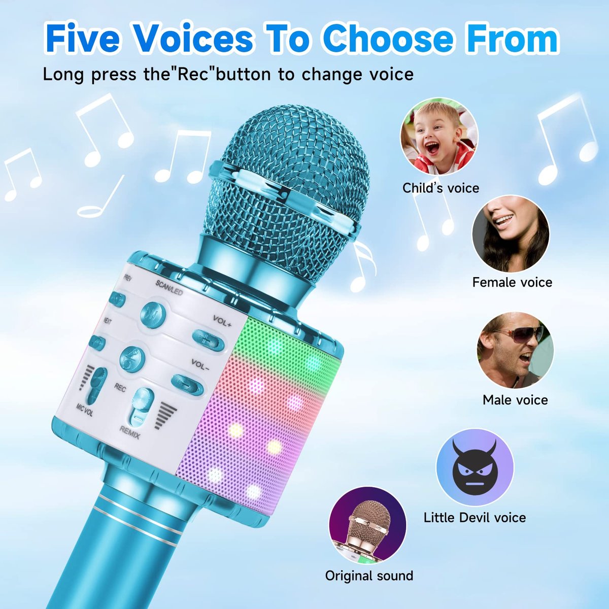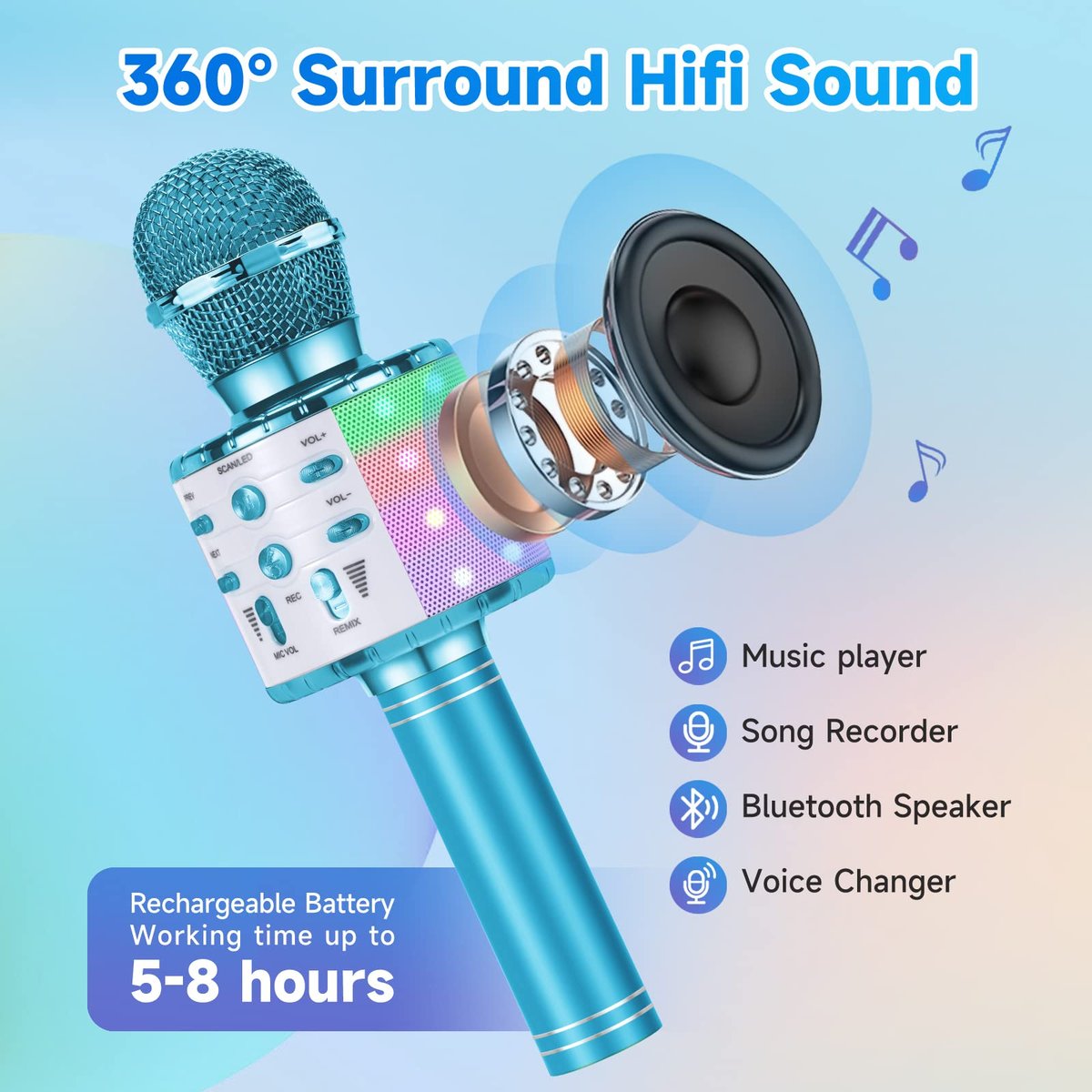 【Wielofunkcyjny dziecięcy mikrofon Bluetooth】Ten bezprzewodowy mikrofon może służyć jako mikrofon Bluetooth, głośnik, rejestrator dźwięku lub zmieniacz głosu. Dzięki kolorowym diodom LED tworzy atmosferę KTV. Idealny do śpiewania dla dzieci, rodzinnych występów KTV/imprez itp.