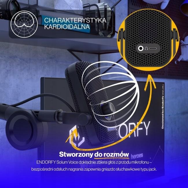 - zawartość zestawu: 1× ENDORFY Solum Voice 1× Regulowane ramię 1× Przewód USB-C 1× Adapter USB-C do USB-A 1× Filtr z pianki 1× Instrukcja obsługi
