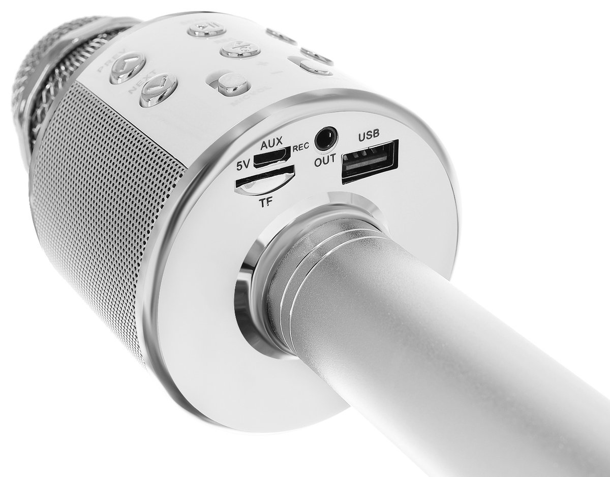 MIKROFON KARAOKE Z GŁOŚNIKIEM SREBRNY MULTI FUNKCJONALNY – mikrofon z dwoma głośnikami, umożliwia odsłuchiwanie oraz nagrywanie piosenek; łączy się z urządzeniami ...