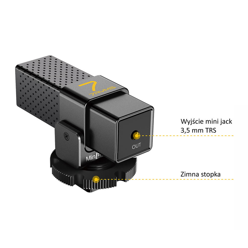 Niewielki mikrofon pojemnościowy 7Ryms MinBo Mini o kardioidalnej charakterystyce kierunkowej. Wyposażony w port mini jack 3,5 mm i dwa wymienne kable c€“ TRS i TRRS c€“ współpracuje z aparatami fotograficznymi, kamerami video, smartfonami i innymi urządzeniami mobilnymi. Montaż na stopkę ISO lub statyw z gwintem 1/4c€™c€™. W komplecie osłona przeciwwietrzna deadcat.