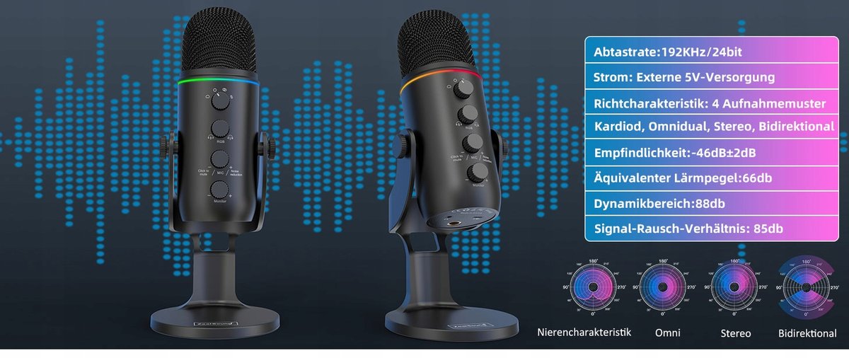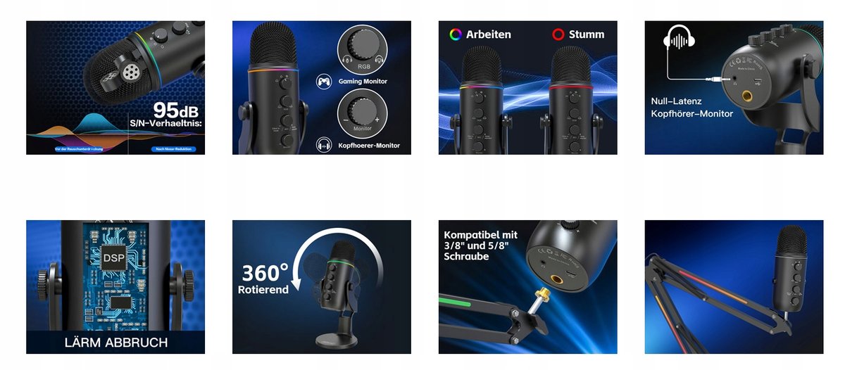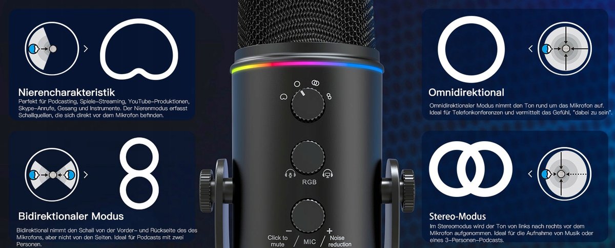 - 【Profesjonalny pokrętło wzmocnienia mikrofonu】Ten mikrofon USB do podcastów posiada pokrętło wzmocnienia. Swobodnie dostosuj głośność i czułość mikrofonu podczas nagrywania, aby uzyskać doskonały dźwięk. Obniżaj wzmocnienie, aby skutecznie redukować hałasy otoczenia, a przeciwnie - zwiększaj czułość. Funkcja Echa posiada kontrolę poziomu i można ją wyłączyć przy pomocy pokrętła echa. Diody LED przypominają o wyłączeniu wyciszenia, abyś nie zapominał o jego anulowaniu.