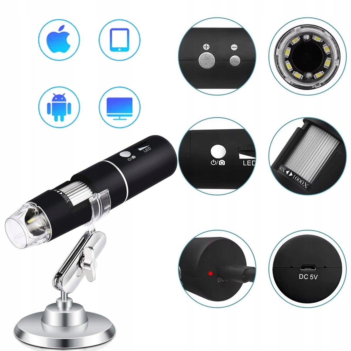 | Nazwa: | MIKROSKOP CYFROWY 1000x 2MP 8 LED WIFI ANDROID iOS 1000x USB-C 360 |