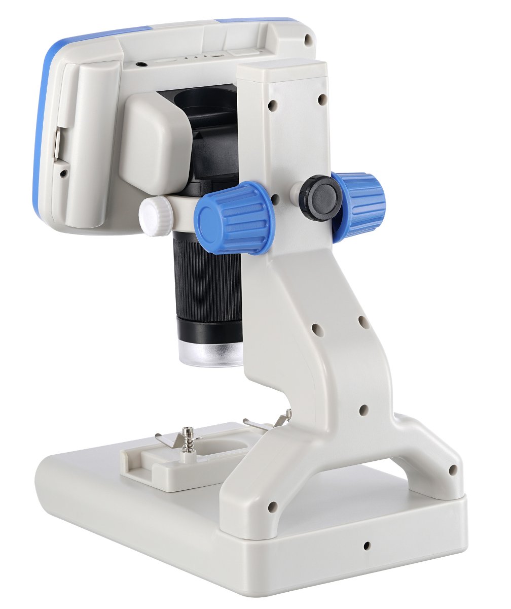 Mikroskop staje się przenośnym przyrządem pozwalającym na pracę z dala od źródła zasilania. Właściwości: Obracany kolorowy 5-calowy wyświetlacz LCD Jakość obrazu: 12 Mpx, jakość filmów: Full HD Oświetlenie LED z regulacją jasności Zestaw zawiera gotowe do użycia preparaty mikroskopowe