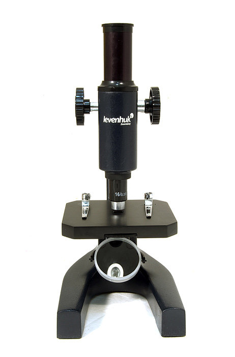 Ten monokularowy mikroskop posiada pojedynczą, achromatyczną soczewkę obiektywową 16x, co zapewnia czysty obraz bez żadnej aberracji chromatycznej lub sferycznej. W tym modelu głowica jest umieszczona bezpośrednio nad stolikiem, jednak wykorzystując ramię teleskopu, można nachylić zarówno głowicę, jak i stolik pod wybranym kątem, tak aby komfortowo prowadzić obserwacje.