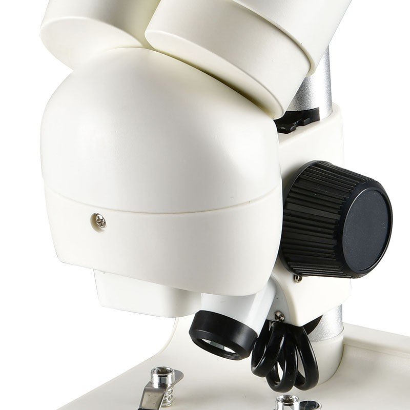 Mikroskop wyposażony został w obustronne pokrętło do ustawiania ostrości przesuwające całą głowicę po solidnym, metalowym trzpieniu osadzonym w podstawie.