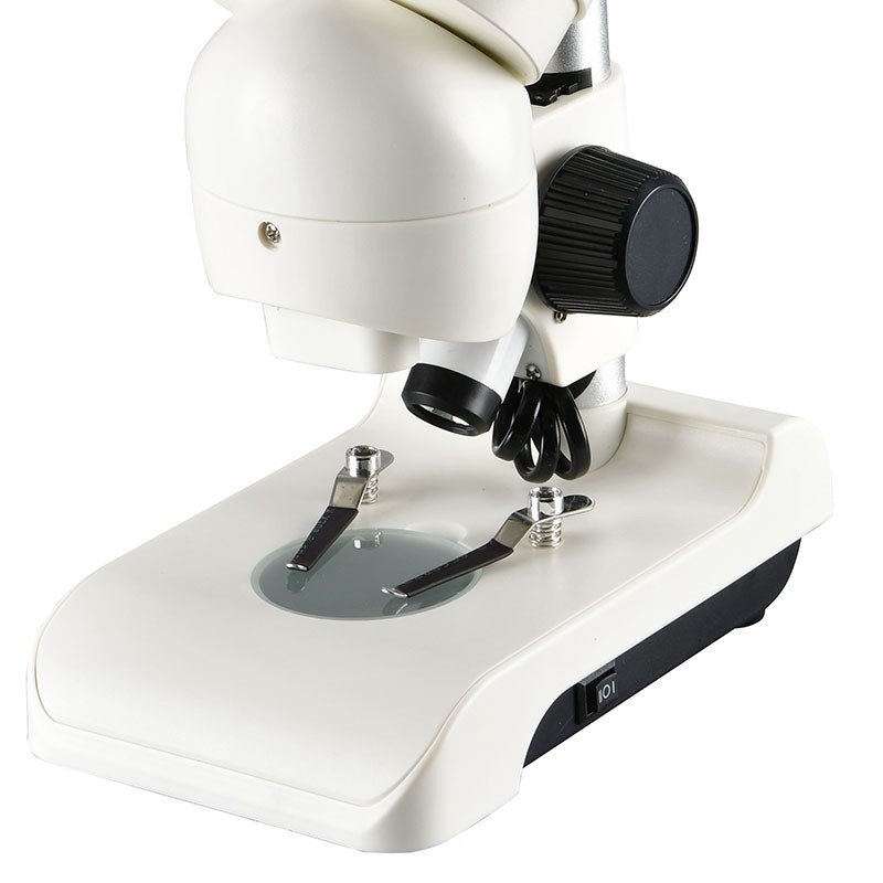 Górna część podstawy mikroskopu pozwala na umieszczenie szkiełka mikroskopowego z obiektem, który jest przytrzymywany i pozycjonowany na stoliku wyposażonym w sprężynujące łapki.