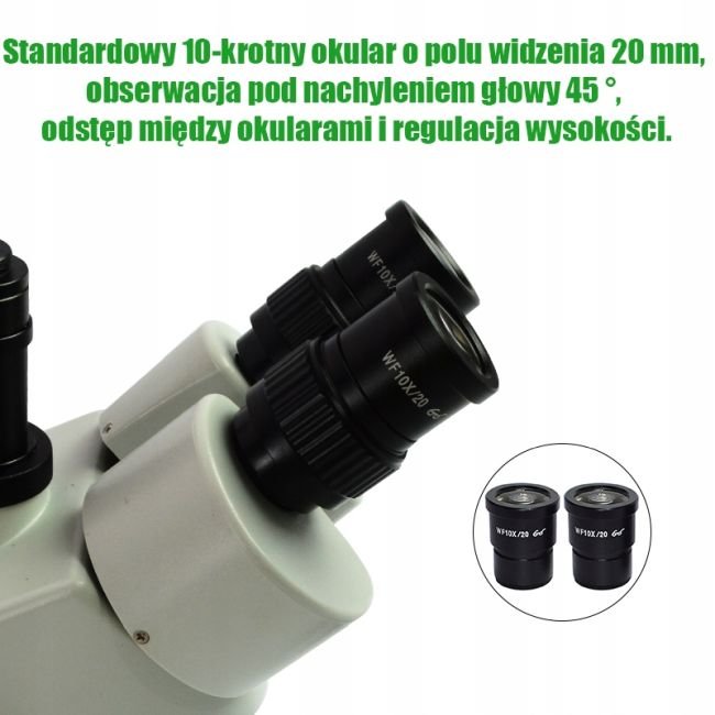 Niezawodny mikroskop, wyposażony w trzy-okularową głowicę nachyloną pod kątem 45 stopni. Zastosowanie trzy-okularowej głowicy pozwala na prowadzenie długich obserwacji bez niepotrzebnego napinania mięśni oraz zmęczenia wzroku (w porównaniu z mikroskopami monokularowymi). Układ optyczny tego modelu został wykonany z wysokiej jakości szkła pokrytego specjalną powłoką, dzięki czemu obraz jest ostry, a kolory – naturalne. Najwyższej jakości optyczne elementy szklane, zakres zoomu 7x-45x. Obrotowa głowica z możliwością obrotu o 360 °, bardzo duża odległość robocza zapewnia wystarczającą przestrzeń do pracy. Obie rurki okularowe posiadają regulację dioptrii, Regulowaną odległość między źrenicami dopasowaną do oczu Zaprojektowany, aby sprostać wymaganiom nowoczesnych profesjonalnych zastosowań mikroskopowych.Podstawa do głowicy mikroskopu regulowana w wielu zakresach.