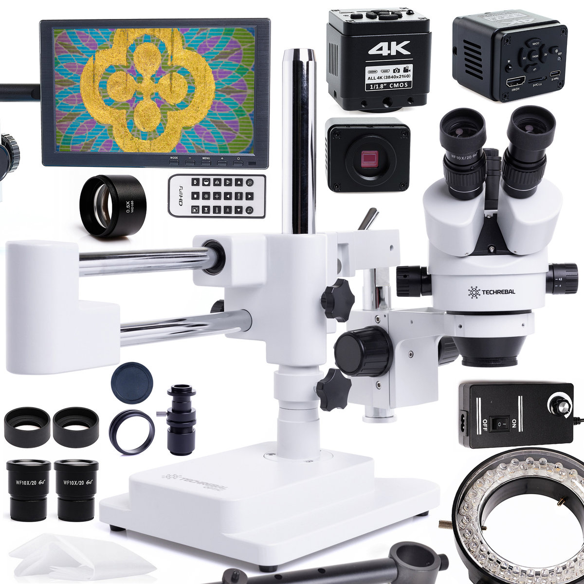 Mikroskop trinokularowy Techrebal 10HW 7-45X + Oświetlenie 56x LED + Barlowa 0,5 + Wyświetlacz 10 cali + Kamera Techrebal Black PRO 4K 8mp + Uchwyt wyświetlacza