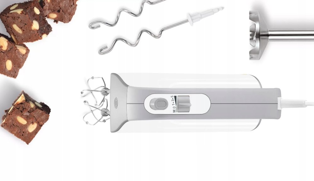 | Funkcje miksera: | regulacja prędkości, funkcja turbo, przycisk zwalniający końcówki, miksowanie, mieszanie, ubijanie, wyrabianie ciasta, blendowanie |