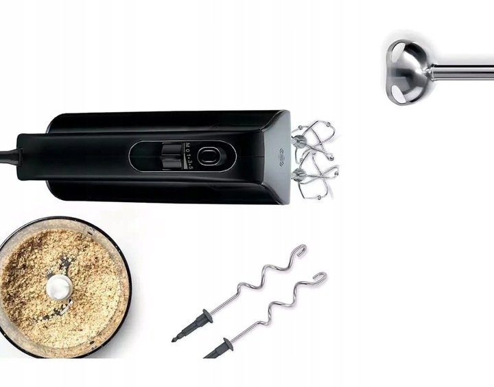 Wyposażenie: 2x Końcówki do ubijania FineCreamer, 2x Haki do ciast, 1x Rozdrabniacz, 1x Stopa miksująca, 1x Pojemnik do miksowania z miarką