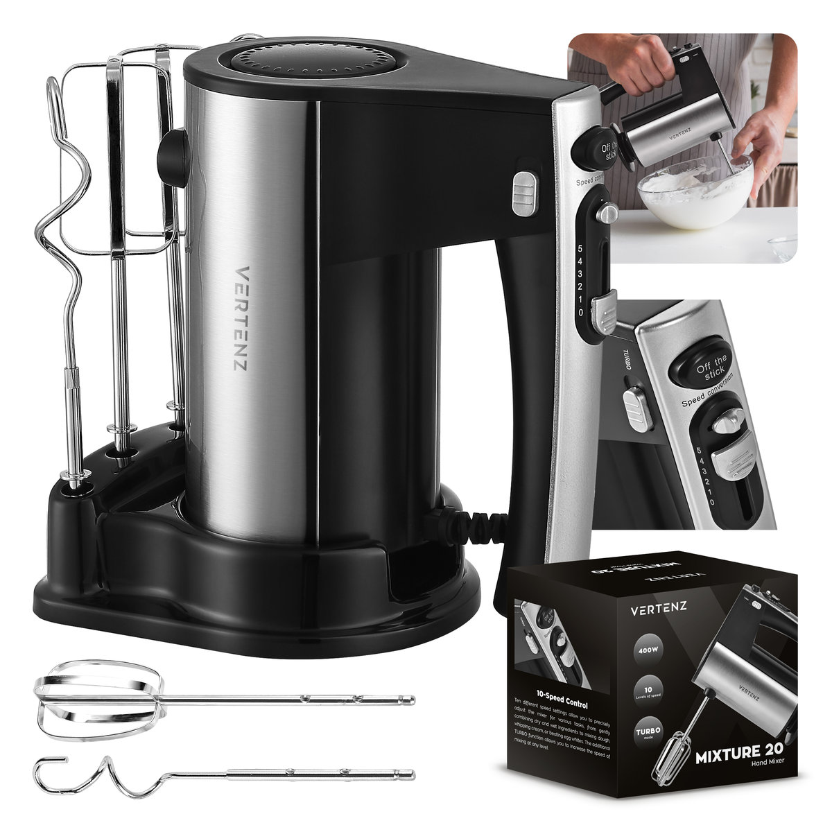 Mikser Vertenz Mixture 20, 10 prędkości, stalowe haki i mieszadła, 4 końcówki, ergonomiczna rączka, system chłodzenia
