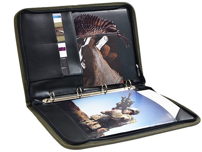 Producent: Mil-Tec Materiał: Poliester z powłoką PVC Wnętrze: Skóra ekologiczna Notesy nie większe niż A4 Velcro na oznaczenia Mechanizm 4-ringowy do koszulek i kartek 5 przegródek, w tym 1 na notes Kamuflaż: Flecktarn