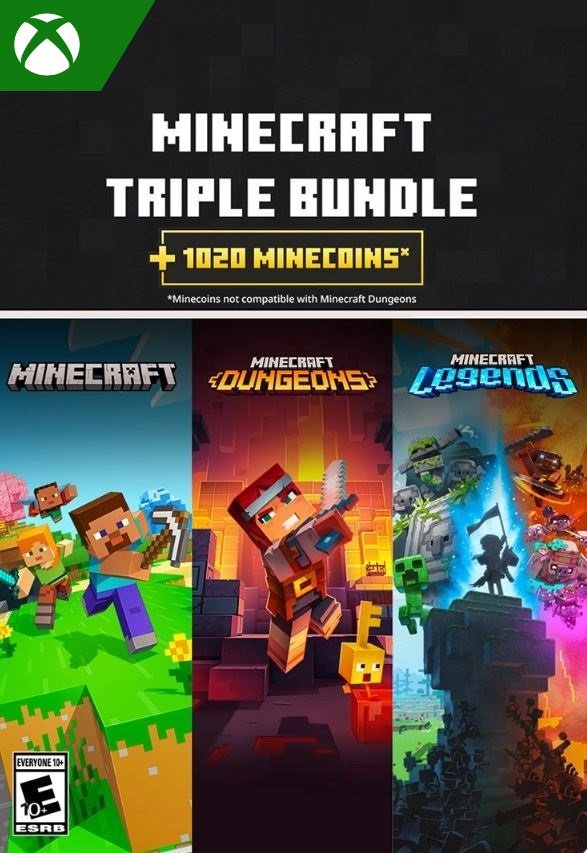 Minecraft Triple Bundle zawiera: Minecraft (Java and Bedrock Edition) Minecraft Dungeons Minecraft Legends 1020 Minecoin Minecraft - Java & Bedrock Edition Twórz, odkrywaj, walcz o ...