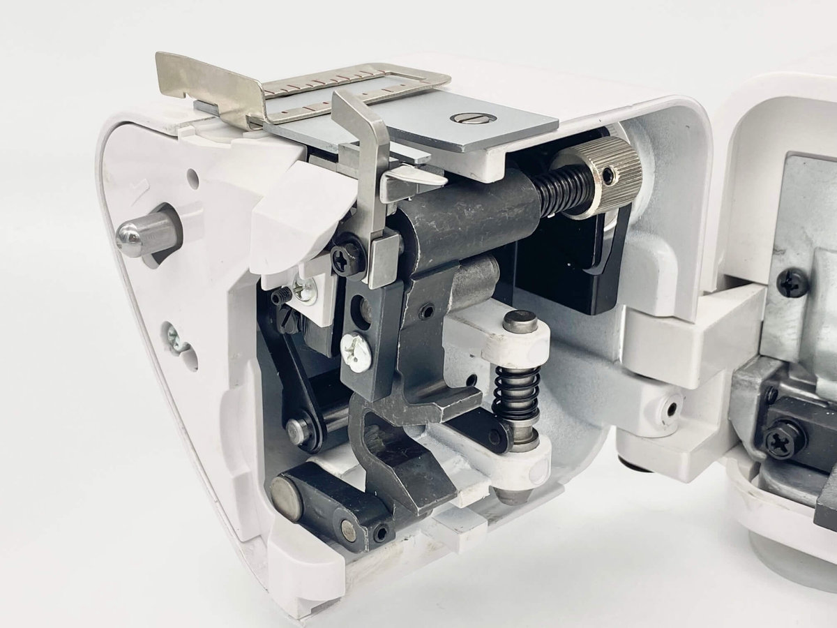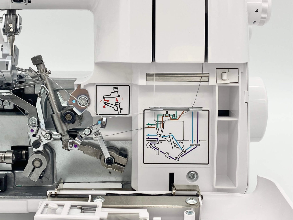 Urządzenie zostało wyposażone w system kolorowego oznaczenia nawlekania, co umożliwia intuicyjne nawlekanie nici krok po kroku. Dodatkowo, odchylane ramię ułatwia dostęp do chwytaczy, a wbudowany schowek zapewnia porządek i wygodny dostęp do akcesoriów podczas pracy.